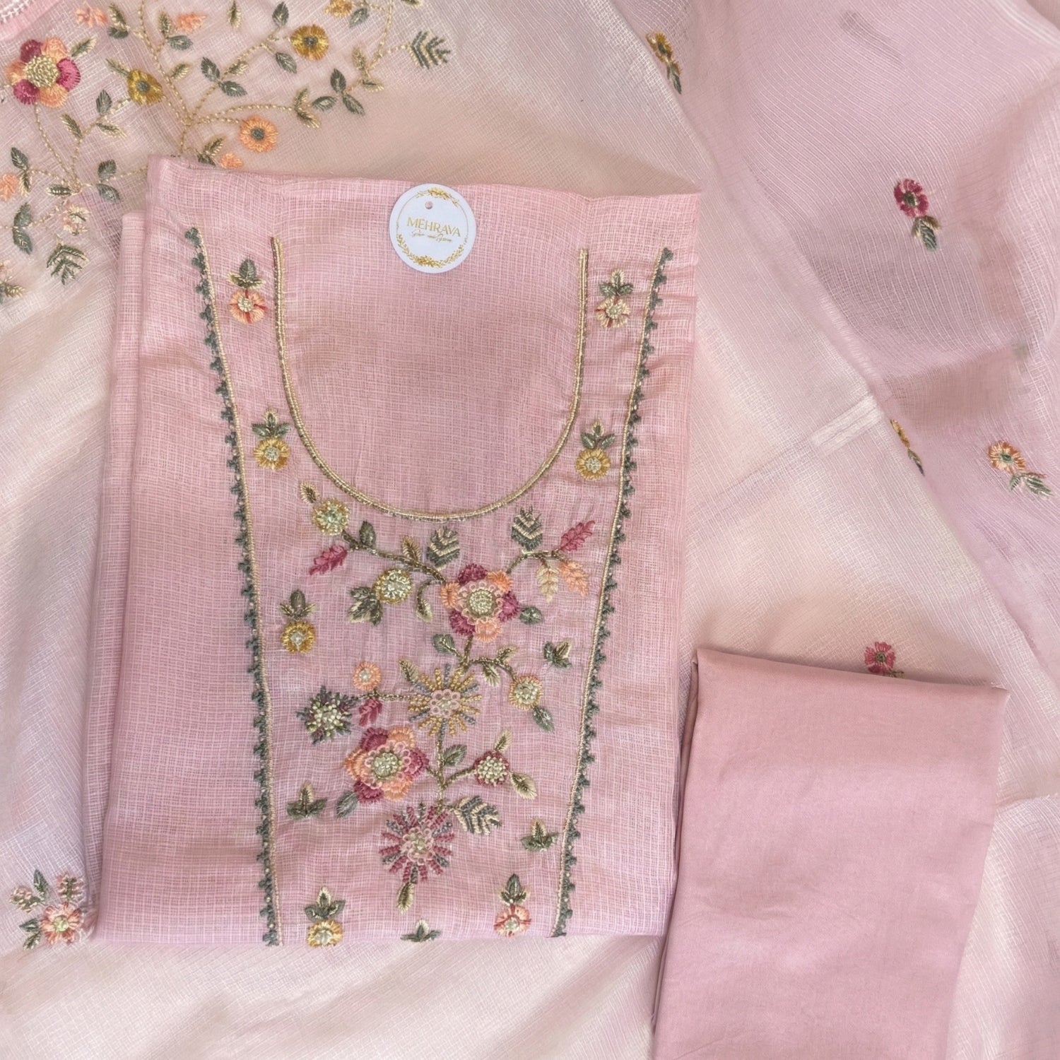 This pastel blush pink unstitched salwar kameez features delicate floral embroidery with gold accents on lightweight, semi-sheer textured fabric. The kameez has a round neckline, central floral motif, and side borders with 3D bead details. The set includes a matching top, solid bottoms, and sheer dupatta.