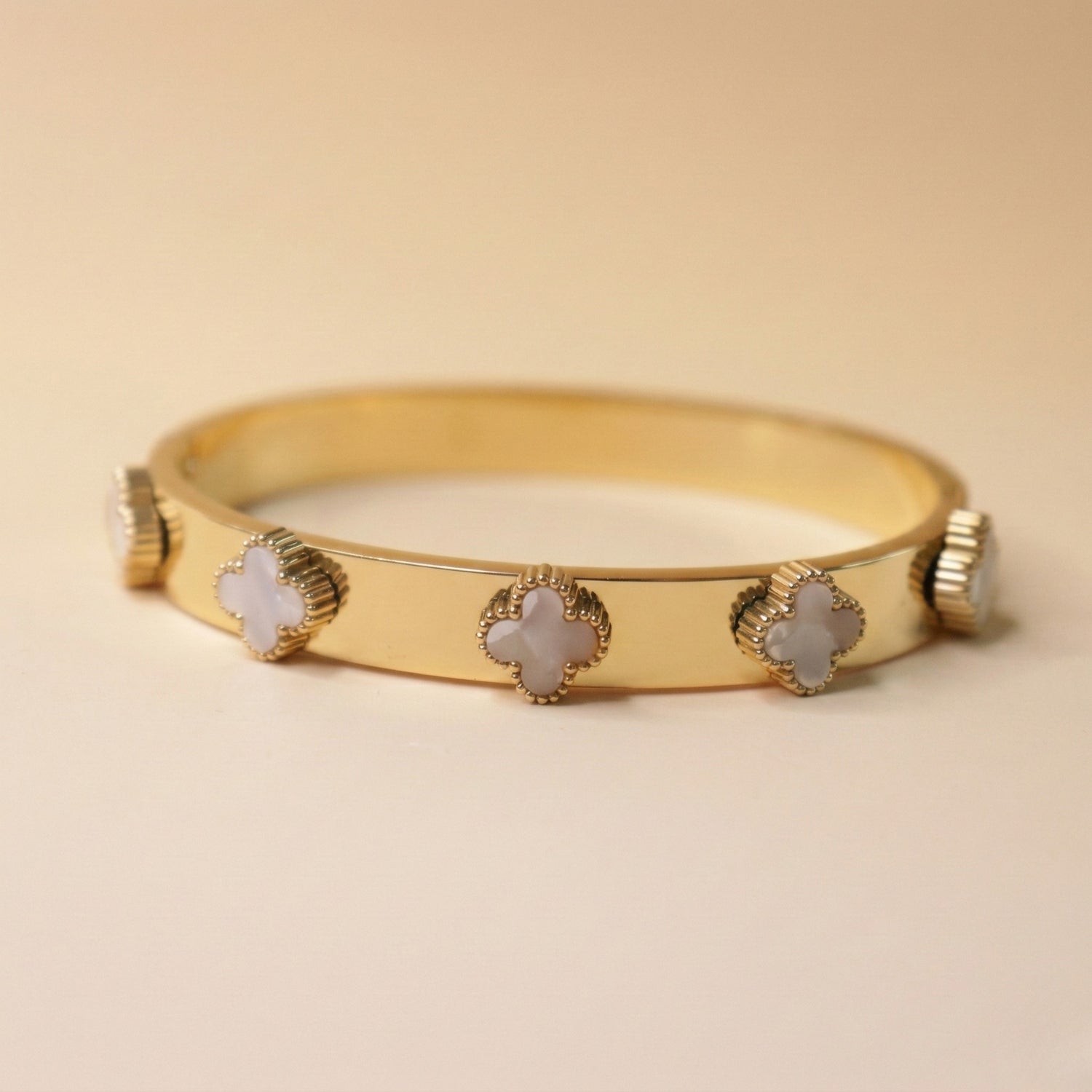 This elegant bangle features a sleek, highly polished 18k yellow gold band with a modern rigid design. The centerpiece showcases a series of finely crafted four-leaf clover motifs, symbolizing good fortune. Delicate gold beading around each clover adds a touch of classic sophistication and timeless charm.