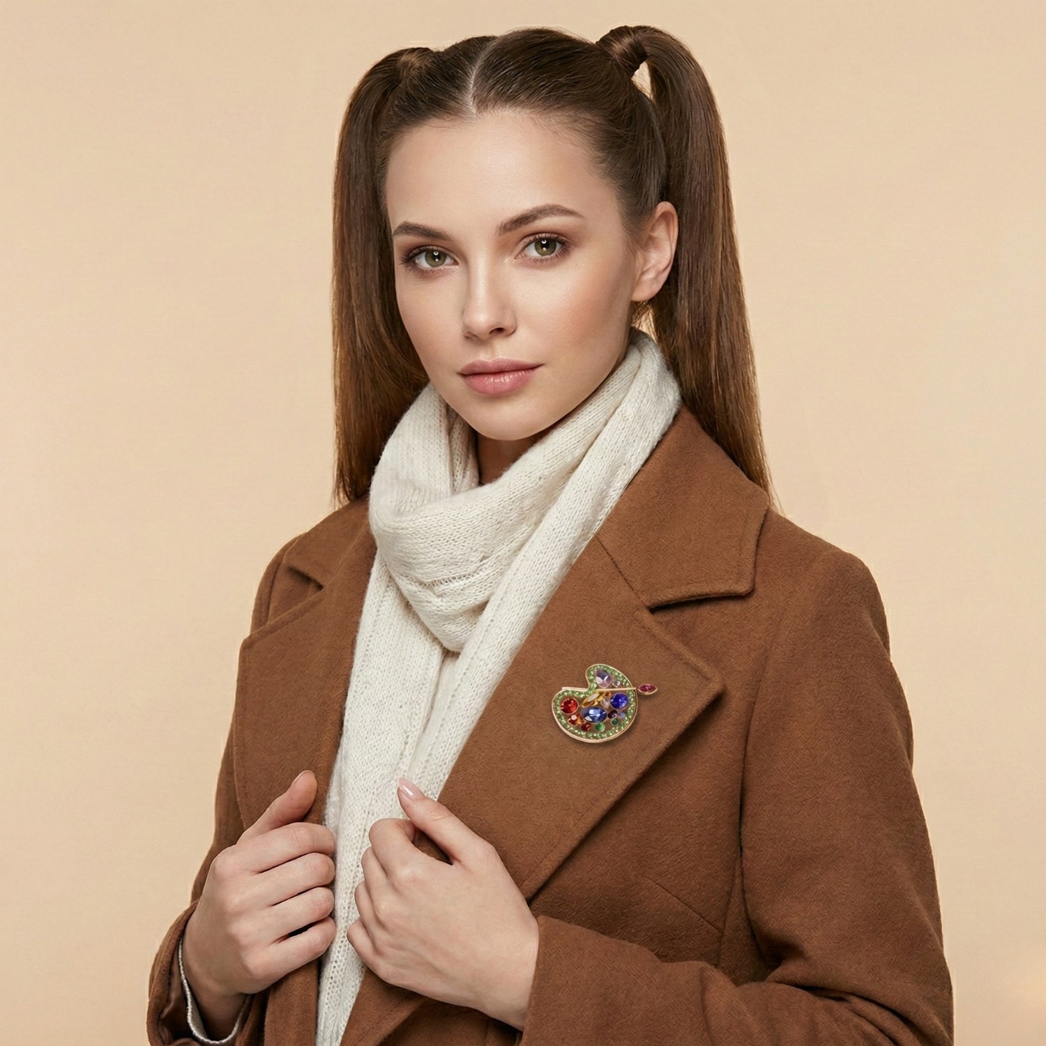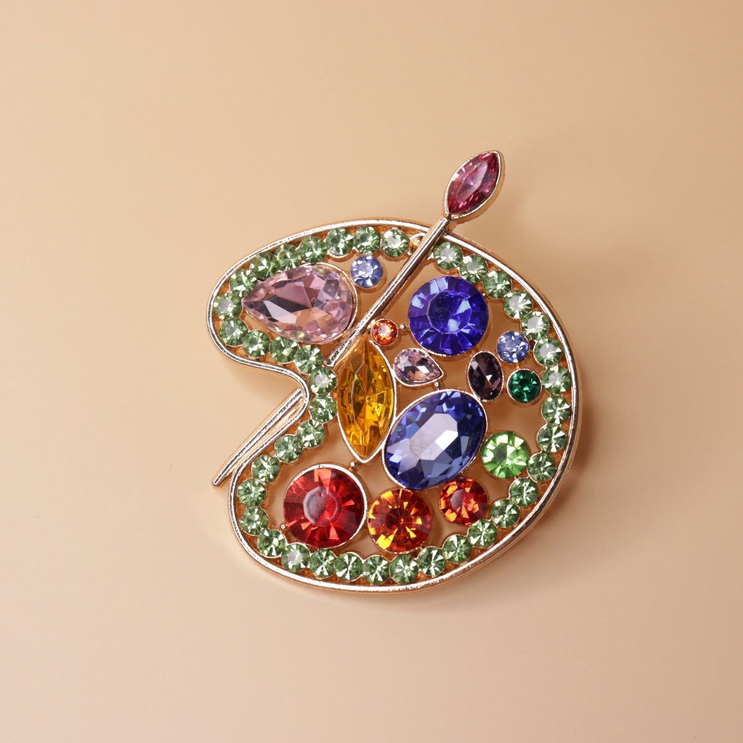 A vibrant gold-toned painter’s palette brooch adorned with multi-colored crystals that capture the spirit of artistic expression. Accented with a delicate gold paintbrush and a fuchsia teardrop crystal, it adds a bold, creative touch to any outfit. Securely finished with a safety-pin clasp for effortless styling.