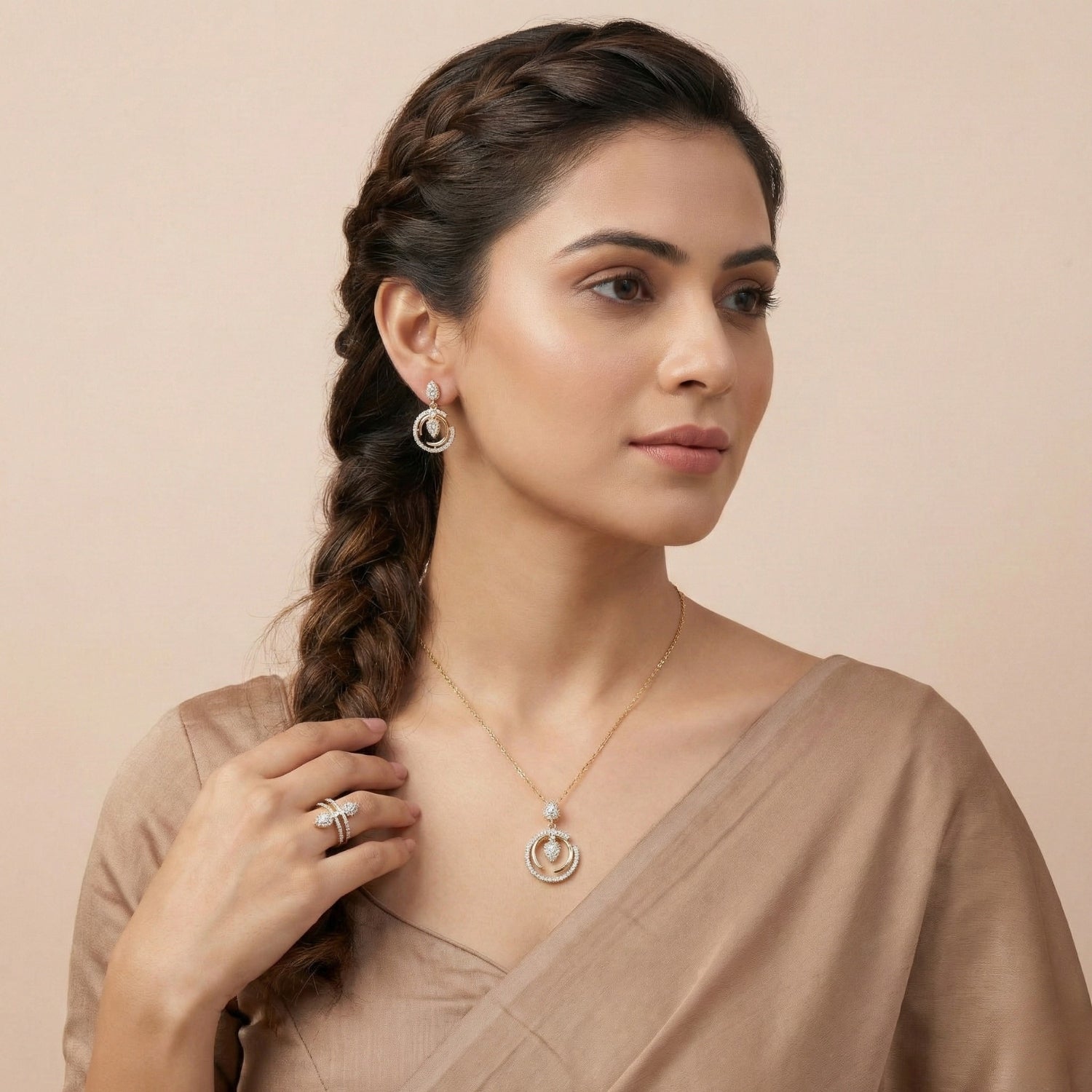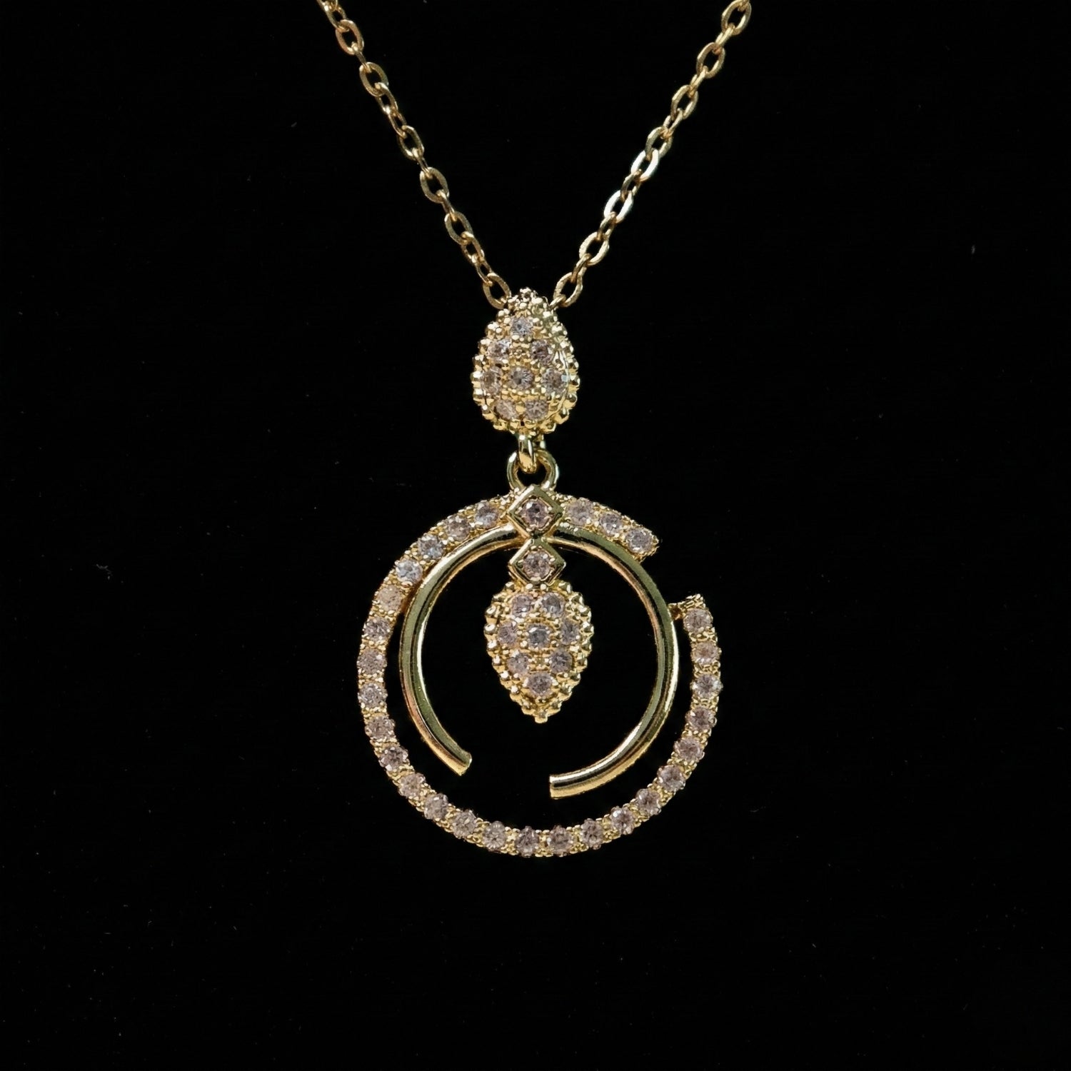 A graceful jewelry set featuring a slim gold-tone chain with a circular pavé pendant. The design is accented with a marquise-shaped stone centerpiece suspended within the orbit motif. Finished with matching drop earrings and a coordinating ring for a cohesive look.