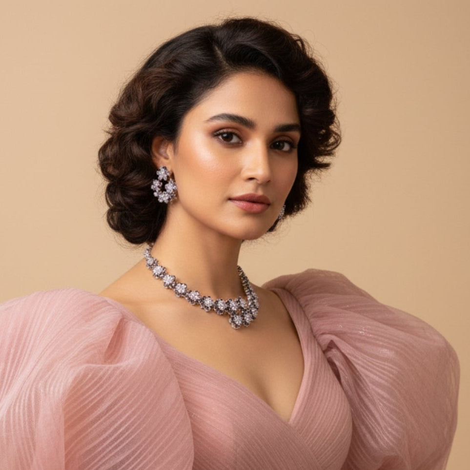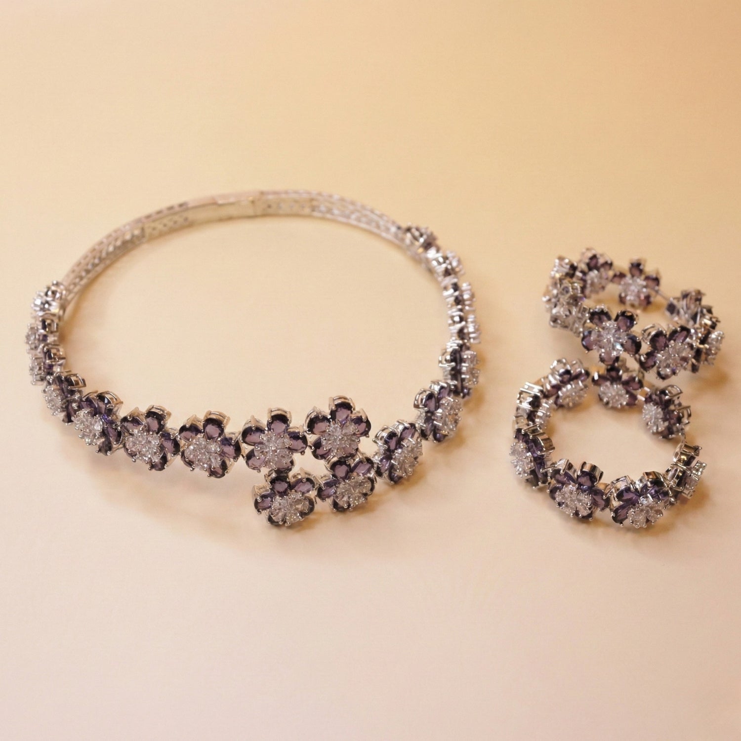 This graceful jewellery set features intricate floral clusters highlighted with luminous colored stones and shimmering white crystals. Designed to sit beautifully on the wrist and finger, it offers a soft yet luxurious statement ideal for special occasions and elegant styling.