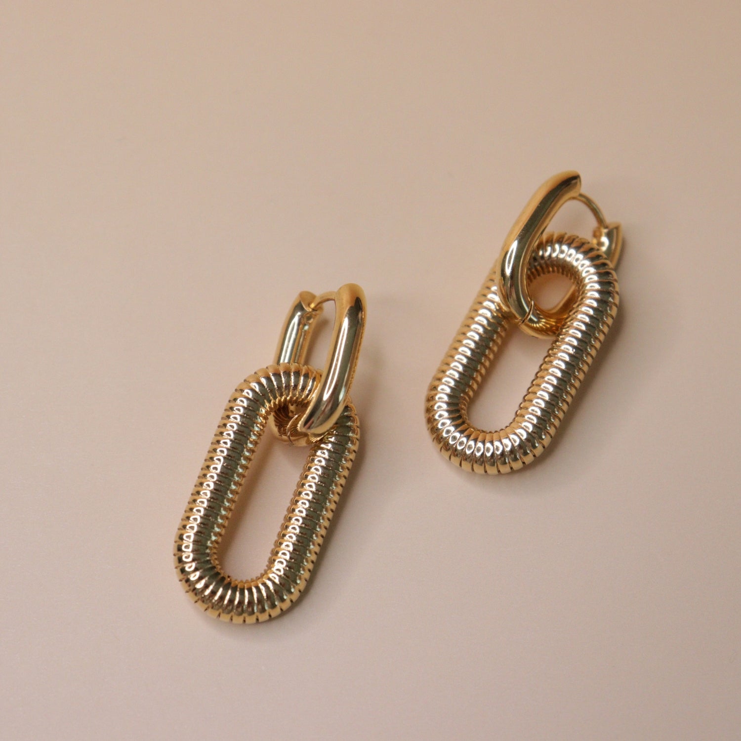 Polished gold-tone drop earrings featuring a sleek hoop top and an elongated oval link with a refined ribbed texture.The high-shine finish reflects light beautifully, giving the design a rich, sculptural presence.Bold yet minimal, they balance modern elegance with confident statement appeal—ideal for everyday wear.