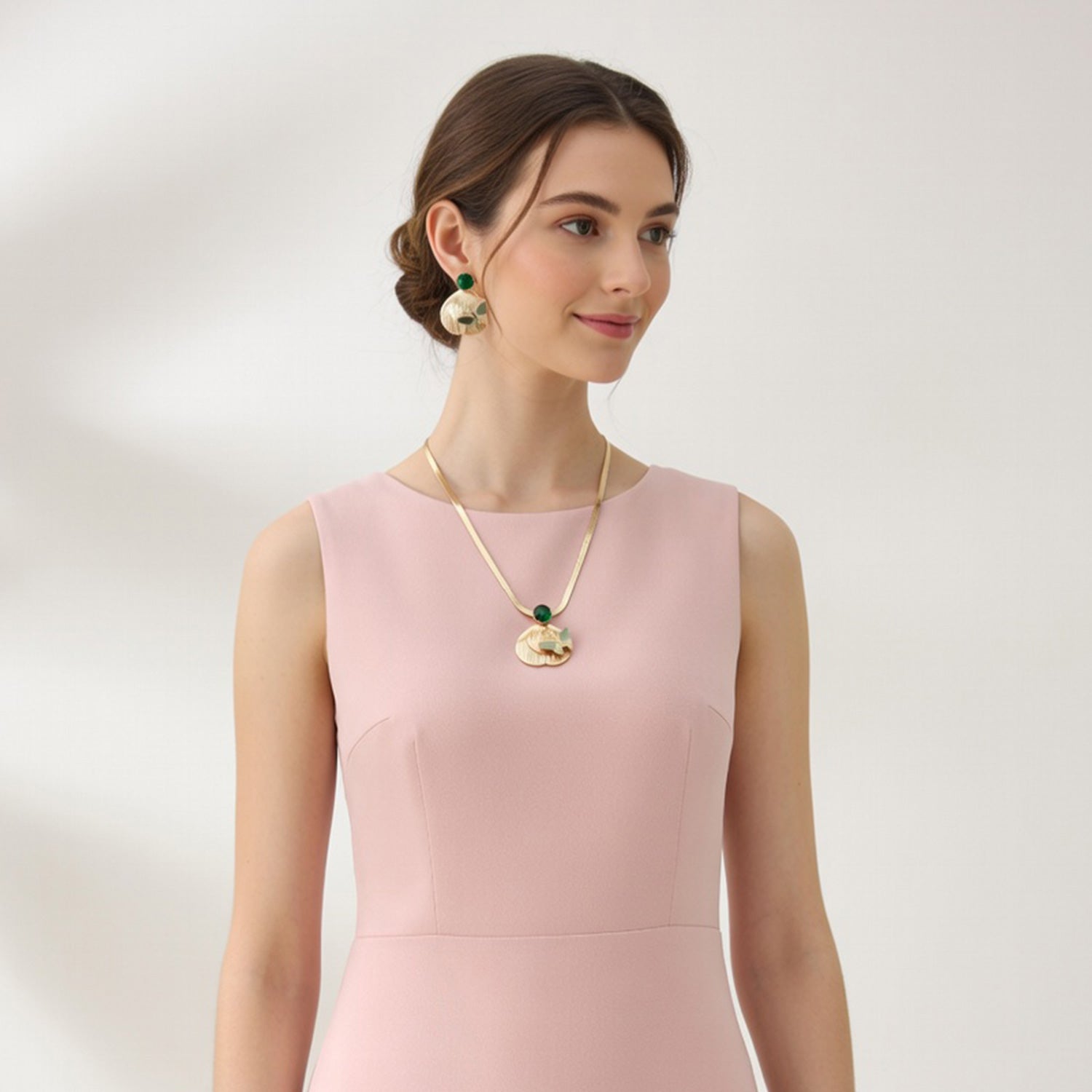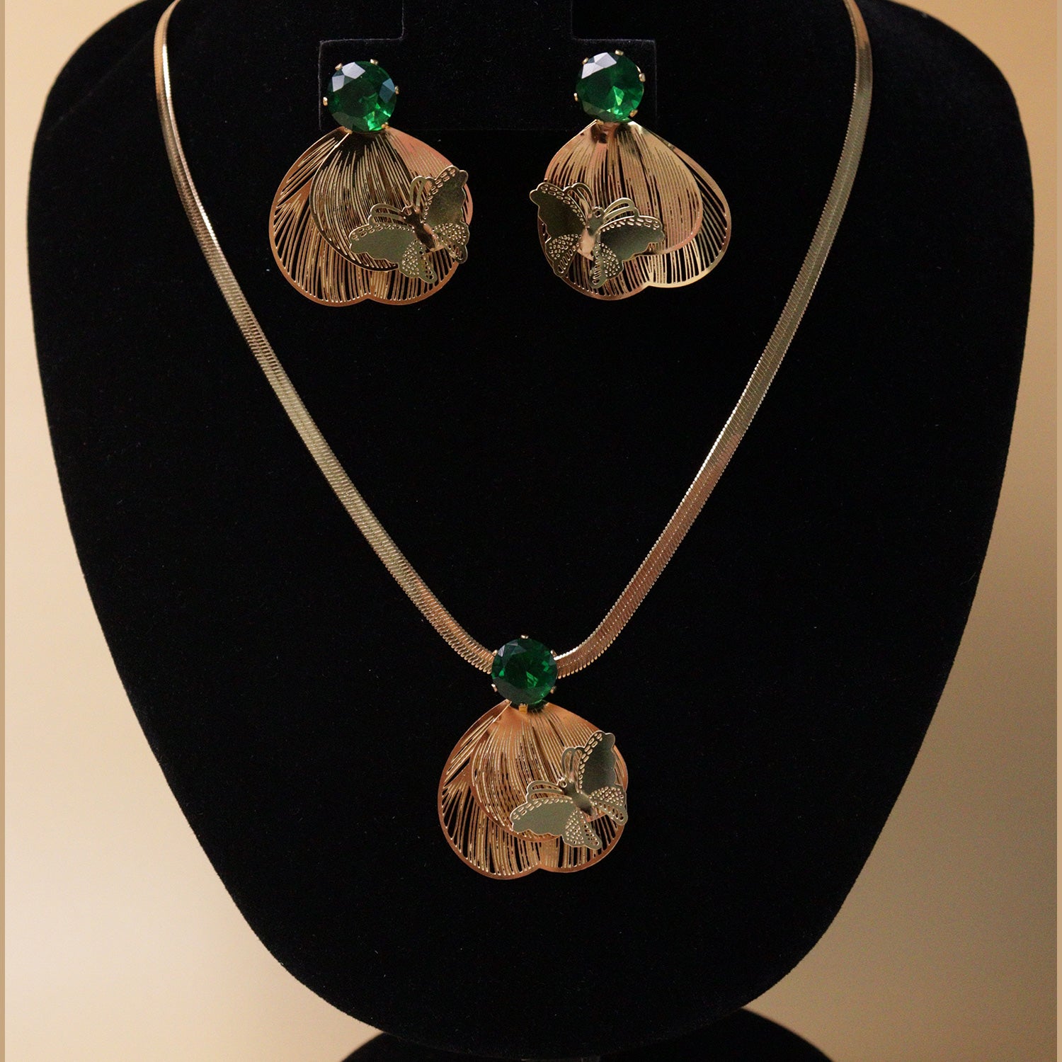 This is a matching necklace and earring jewelry set with an elegant and decorative design. The set is gold-toned and features a round green stone at the top of each piece. Below the stone, there is a detailed fan-shaped metal pattern with a butterfly design attached. The set has a stylish and modern look.