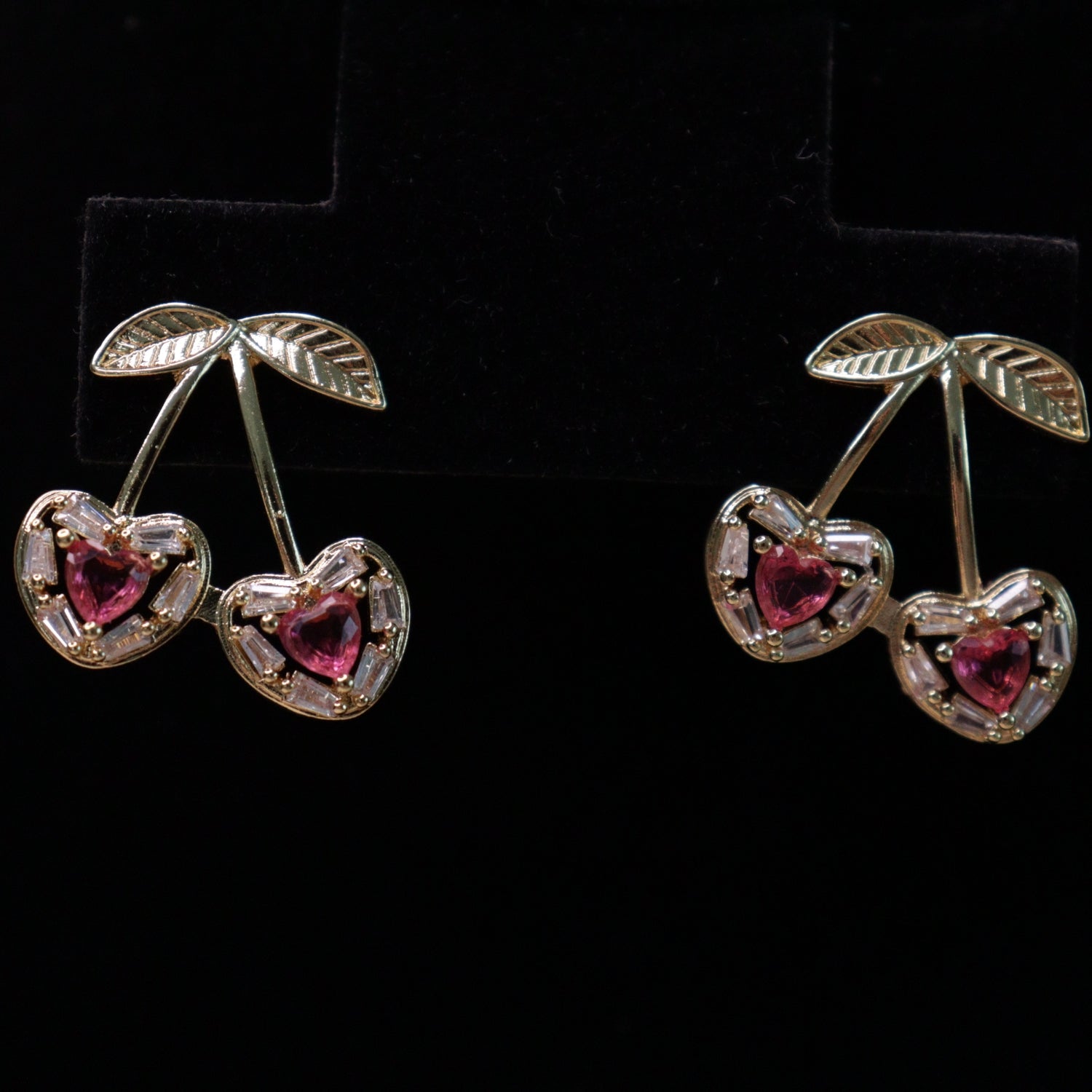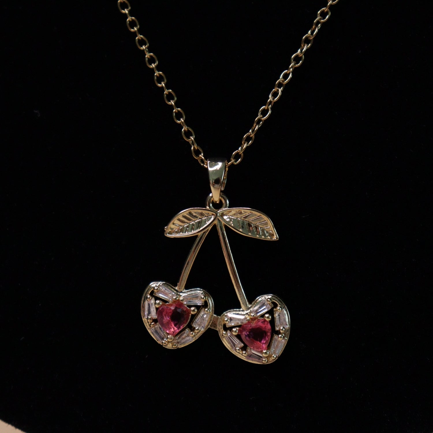A delicate gold-tone necklace paired with matching stud earrings featuring a twin-cherry motif. Each cherry is designed with heart-shaped pink stones, accented by leaf detailing at the top. Lightweight and playful, this set offers a charming, feminine look.