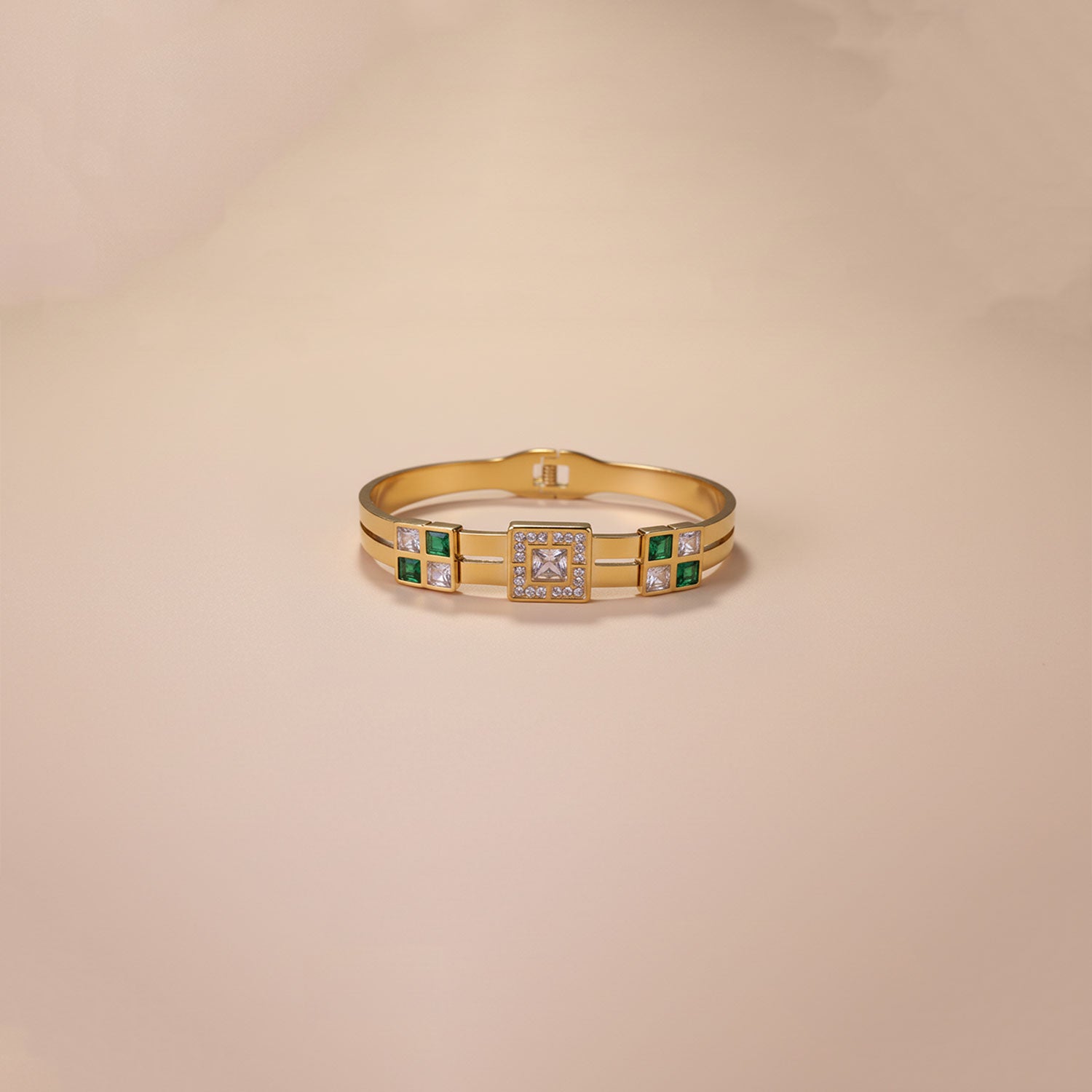 Exude regal elegance with the Crowned Emerald Bracelet, a striking design that celebrates timeless luxury. Crafted in polished gold, this bracelet features rich green emerald-hued gemstones framed in refined, crown-like settings that command attention.