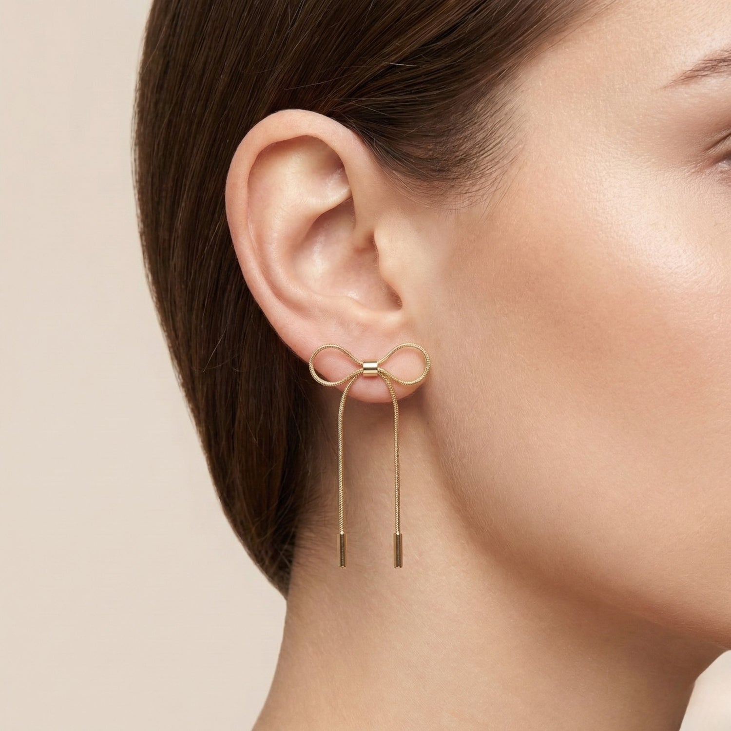 Delicate and feminine, these elegant bow earrings are crafted with polished gold-tone snake chains that create a graceful, fluid drape. The beautifully tied bow knot flows into long tassel strands finished with sleek metal tips for a modern touch. Lightweight and versatile, they add effortless sophistication to both daytime and evening looks.