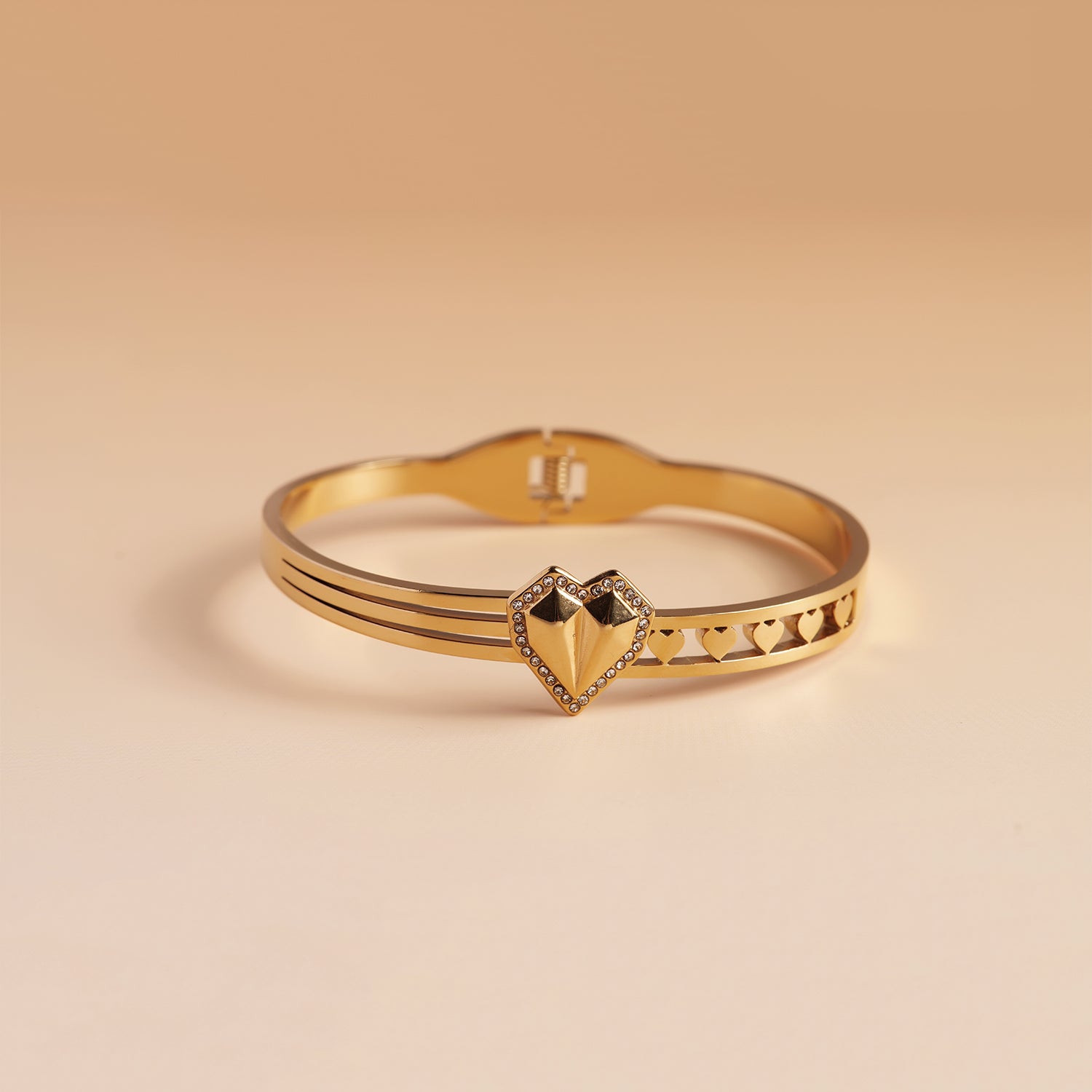 The Diamond-Trim Heart Cuff Bracelet features a sleek heart design accented with sparkling diamond-trim details. Elegant and timeless, it adds a refined touch of shine to any look.