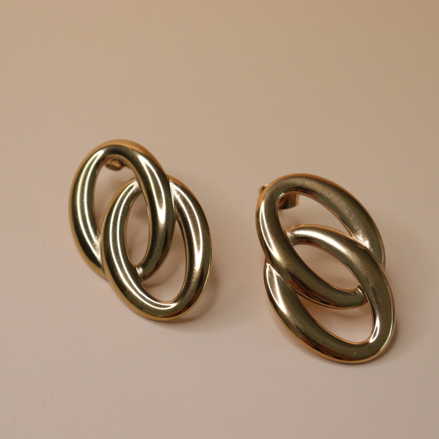 Designed with two overlapping oval rings, these earrings bring a sleek and contemporary vibe. The fluid linked design symbolizes connection and effortless style. A perfect accessory to elevate minimal and chic looks.