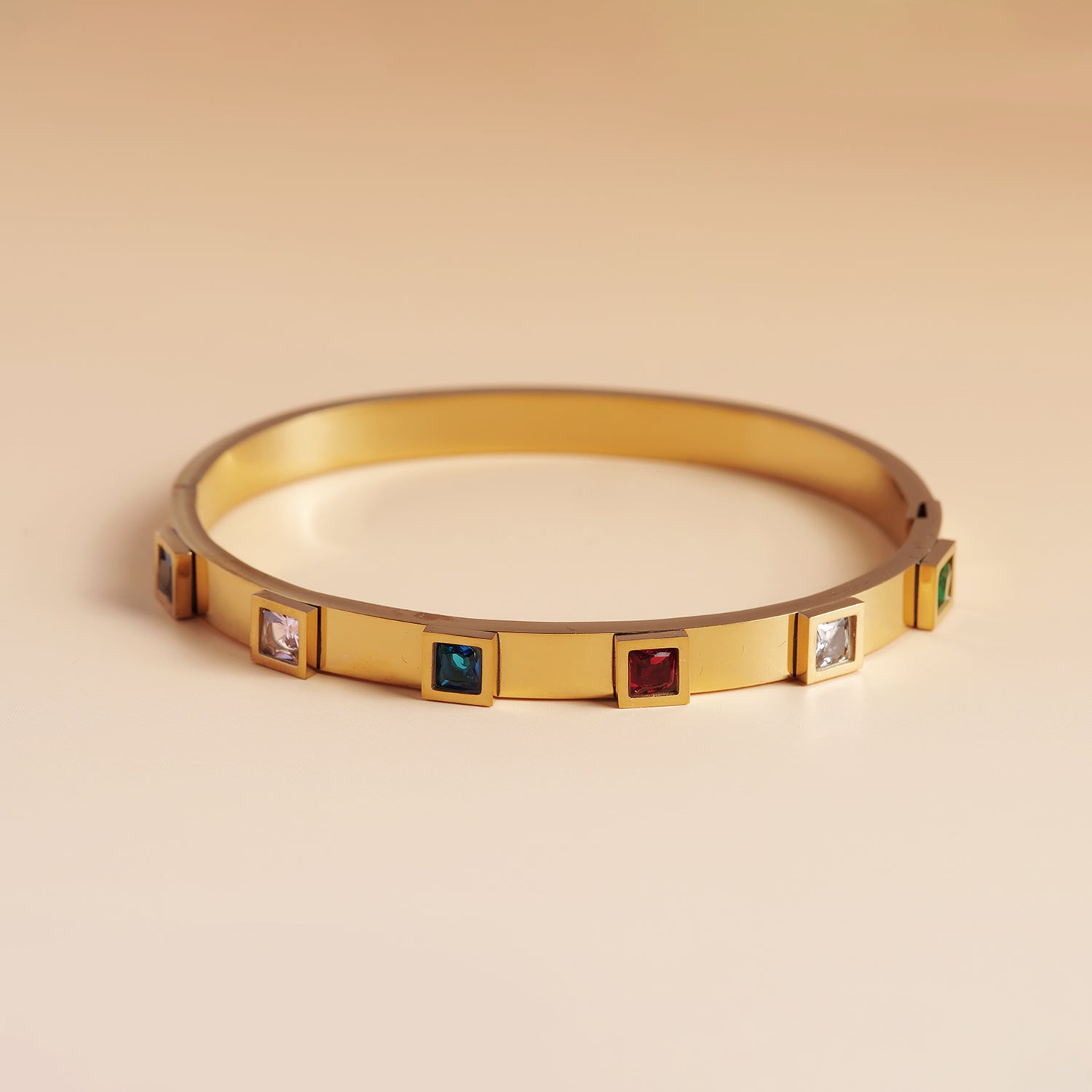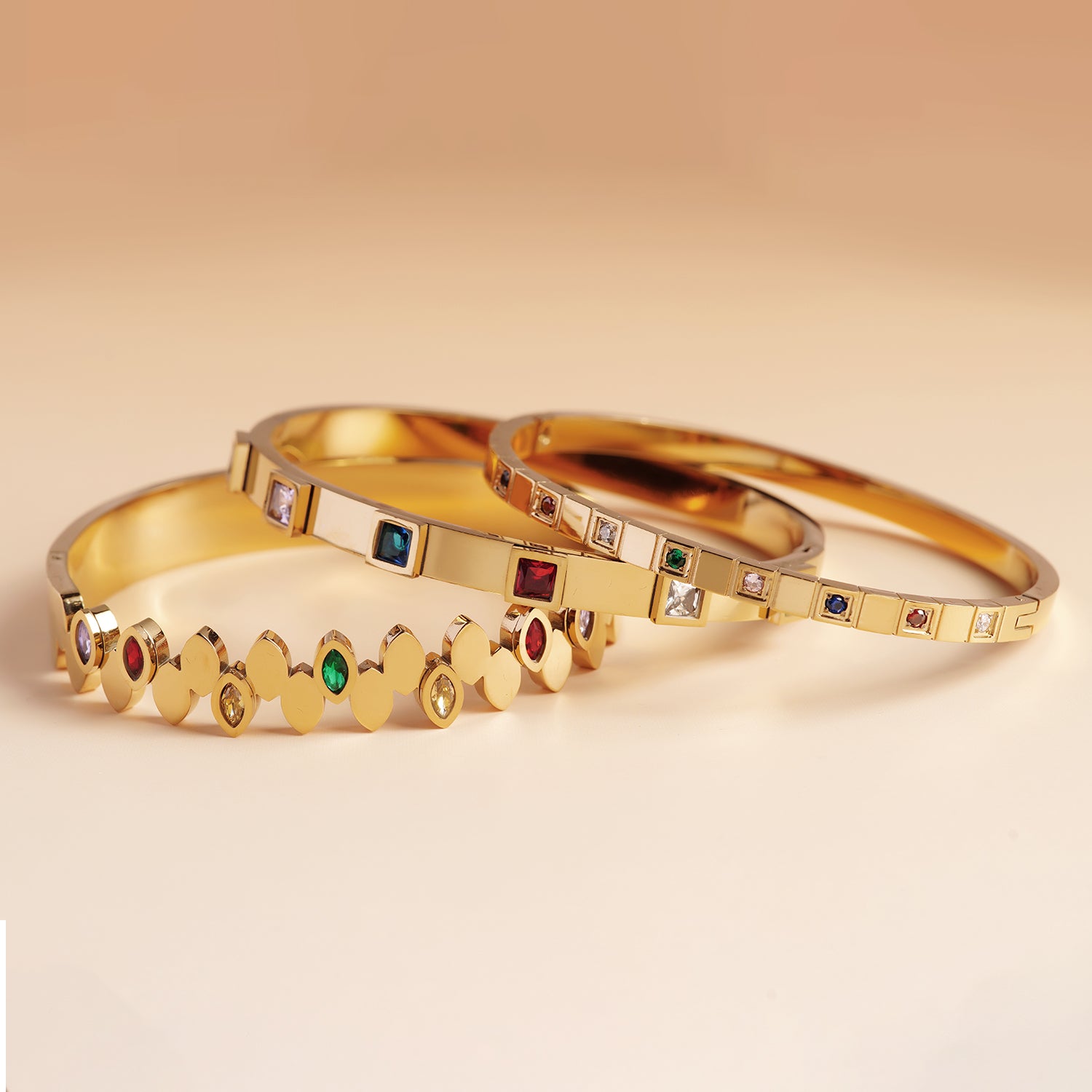 Elegant Multi-Gem Stack Bracelet is a stylish set of three matching bracelets designed to be worn together as a stack. Featuring a sleek gold finish and colorful gemstones, this stack bracelet adds instant elegance and a modern touch to any look. Perfect for everyday wear or special occasions.