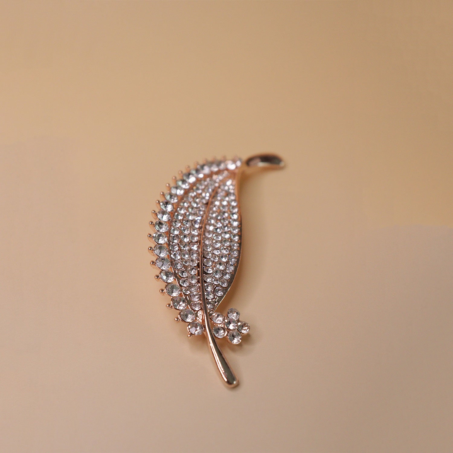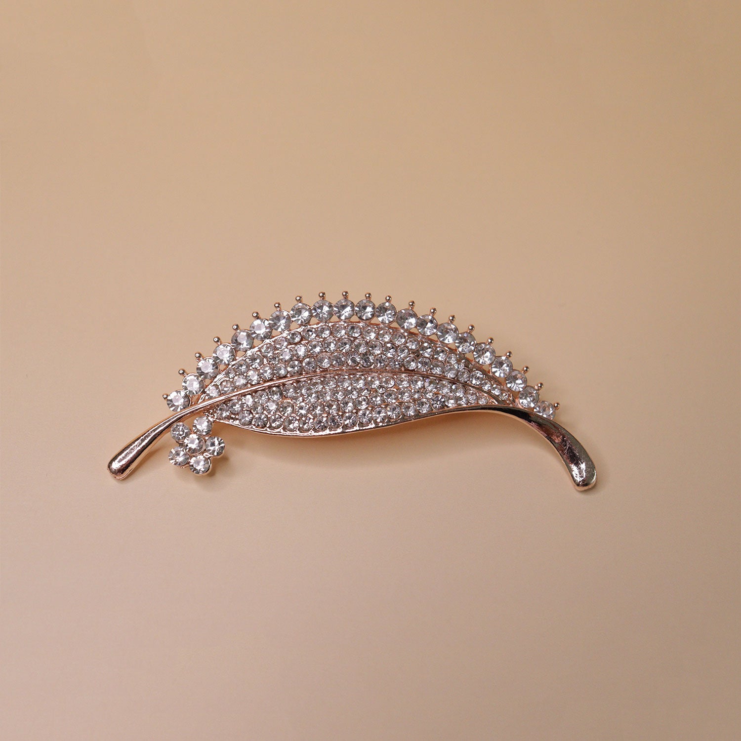 Inspired by the delicate beauty of a feather in motion, this brooch features a refined quill design adorned with finely set crystal stones that shimmer with subtle brilliance. The slender, flowing form is accented by a polished gold-tone finish, highlighting each detailed contour and giving the piece a graceful, lightweight appearance.