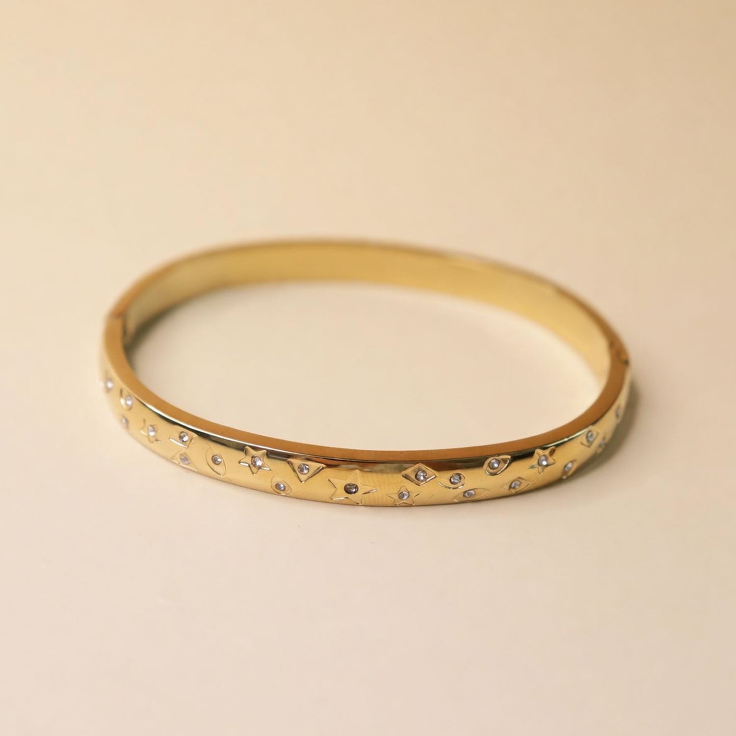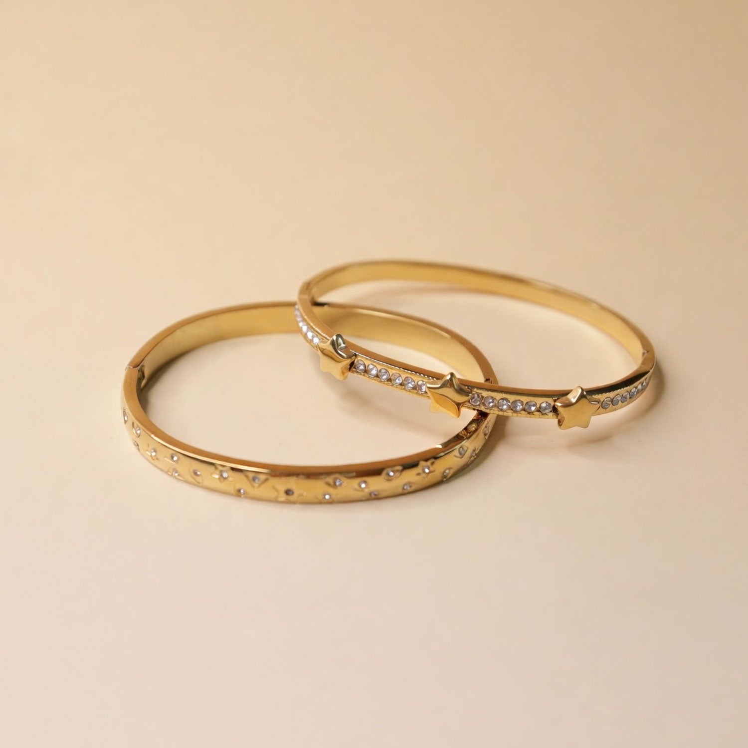 This stylish gold bangle set features a beautiful combination of sleek design and sparkling crystal details. One bracelet is decorated with charming star accents, while the other showcases delicate crystal patterns for extra shine. The polished gold finish adds a luxurious and modern touch.