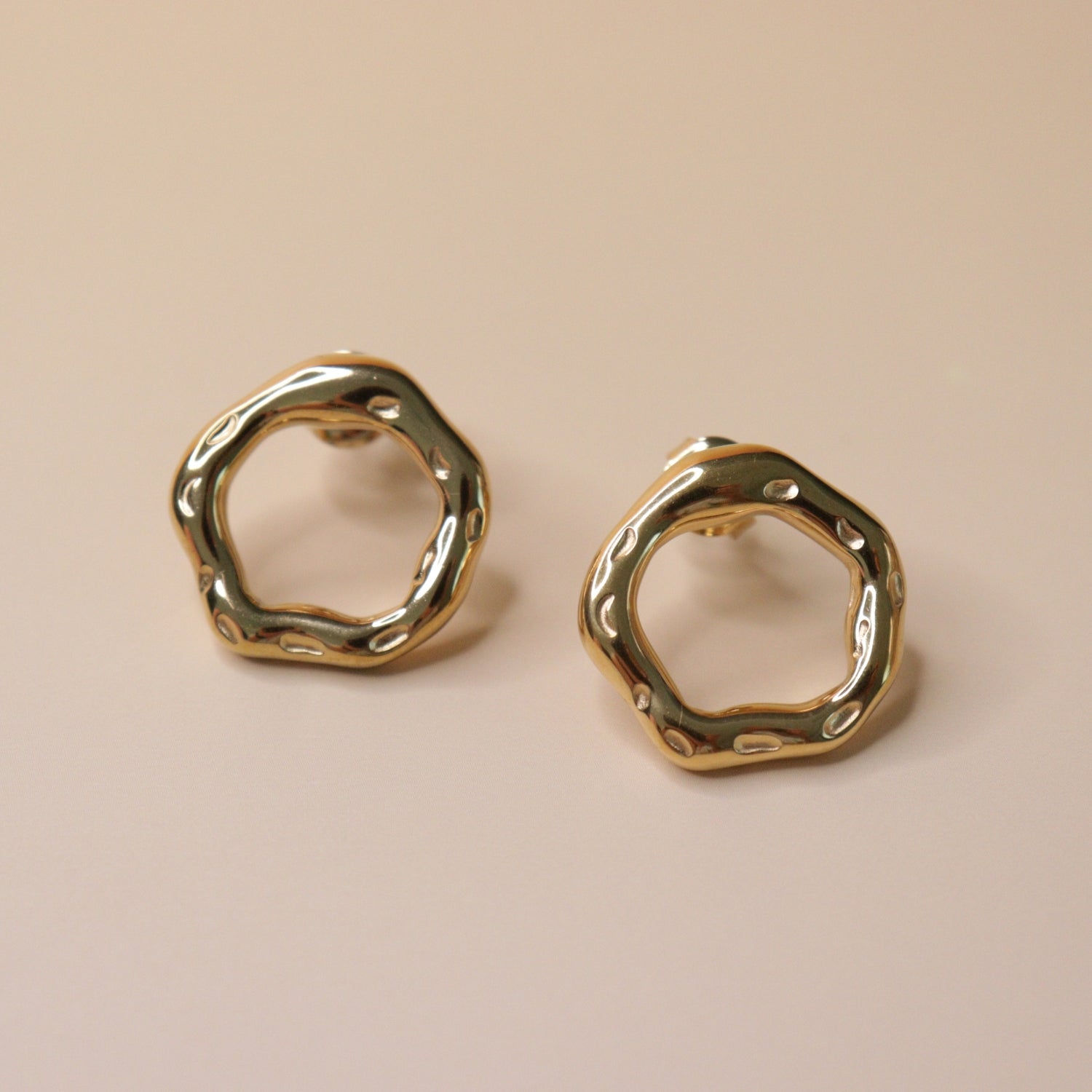 Elevate your jewelry collection with these sculptural gold-toned earrings featuring an architectural, free-form shape. The dimpled texture adds a touch of artisan charm, ensuring these versatile studs provide a polished finish to any ensemble.