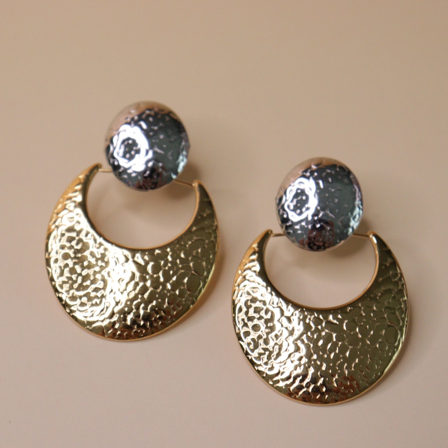 Make a bold style statement with these Golden Crescent Duo Earrings, designed with a sleek two-tone finish. The hammered texture beautifully reflects light, adding depth and elegance to the modern geometric design. Lightweight yet eye-catching, they’re perfect for elevating both everyday outfits and special occasions.