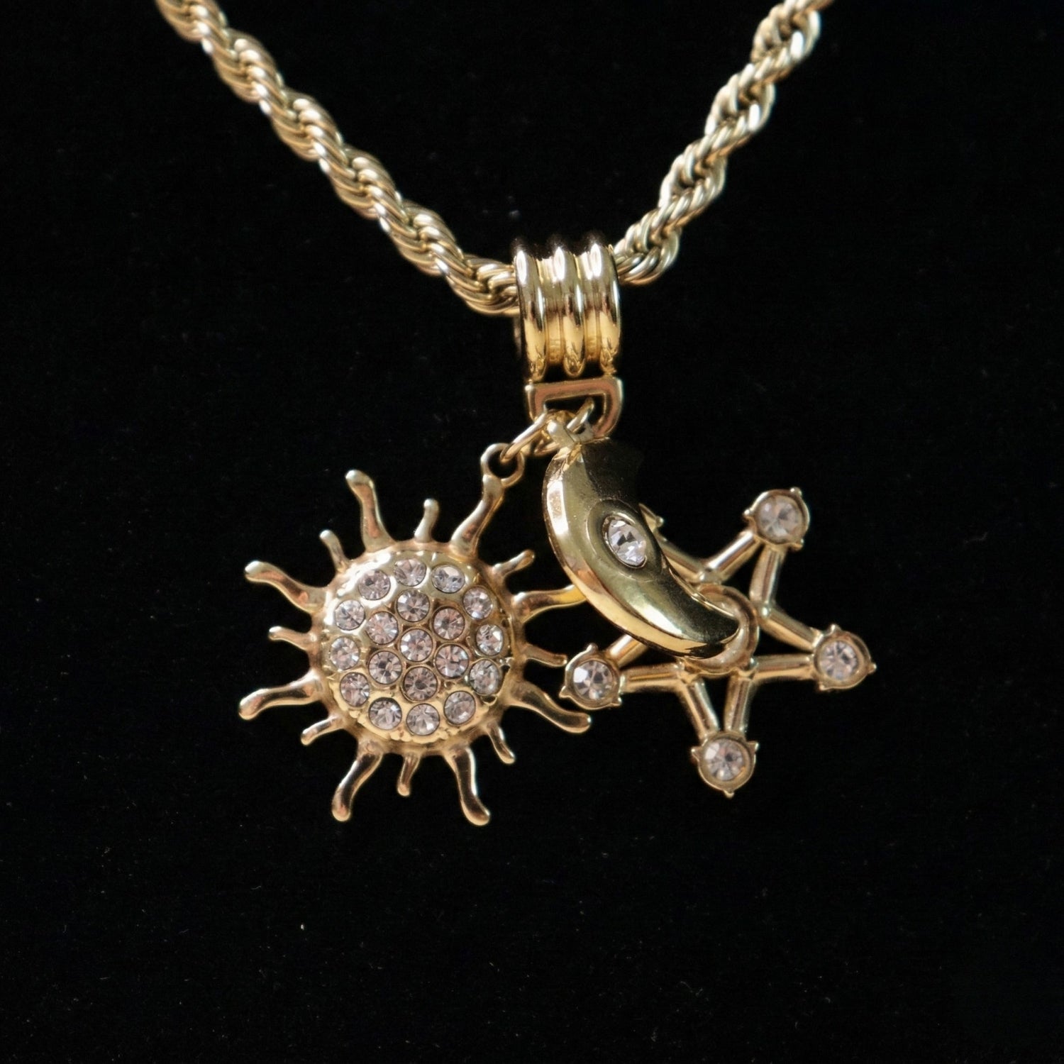 Where day meets night. This statement neck chain captures the beauty of the celestial sky in one stunning focal point. The tiered sun and moon charms create a 3D effect that catches the light from every angle, while the thick rope chain provides a vintage, luxurious feel.