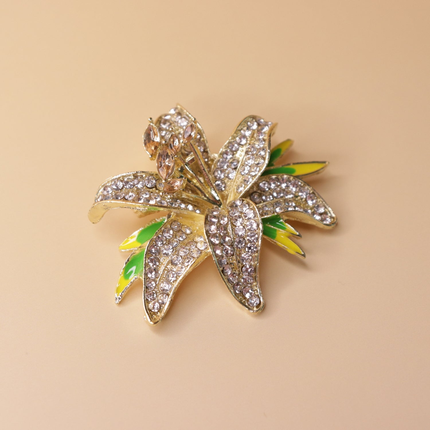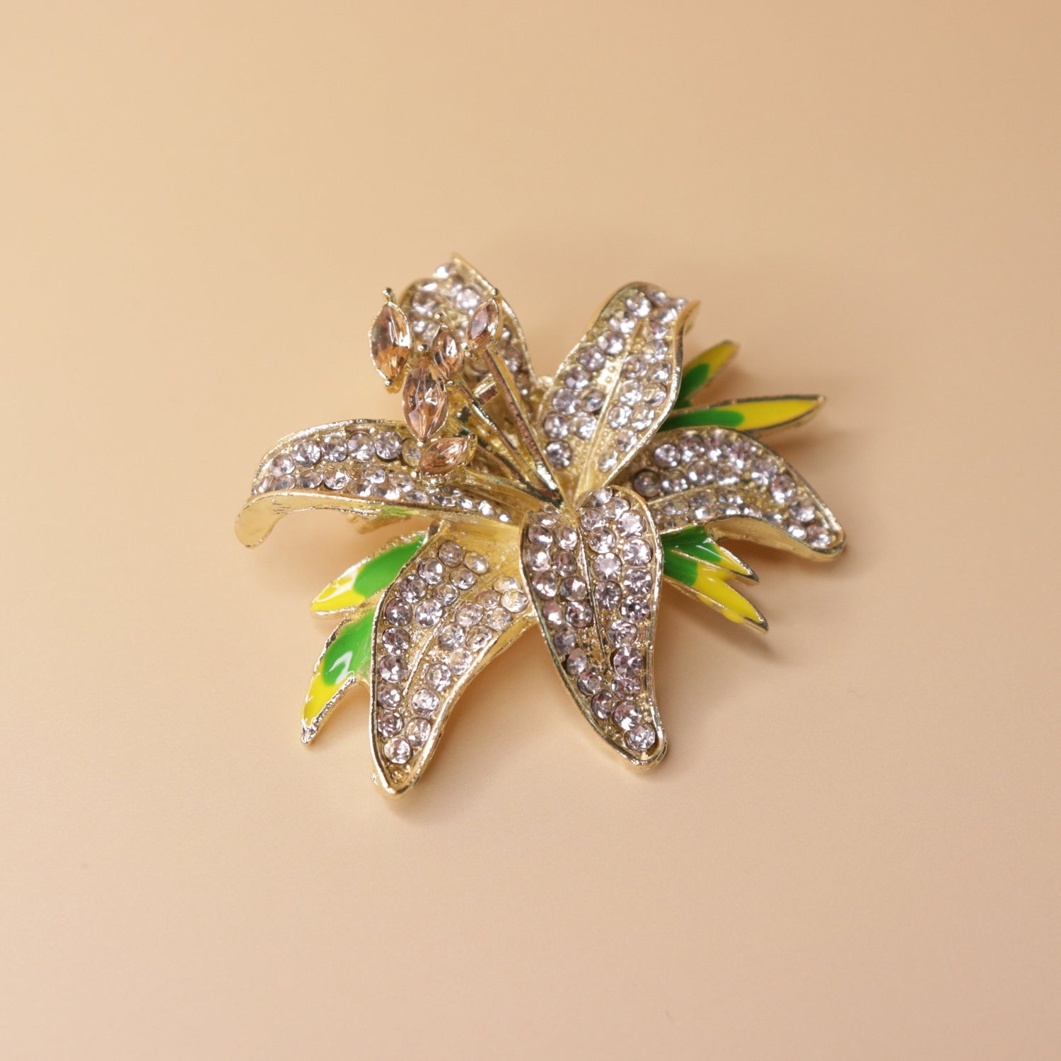 This elegant gold-toned floral brooch is designed in a graceful lily shape, adorned with shimmering crystals for a radiant finish. Subtle green enamel accents add depth and a touch of natural freshness to the layered petals. A timeless statement piece that effortlessly enhances both traditional and contemporary outfits.
