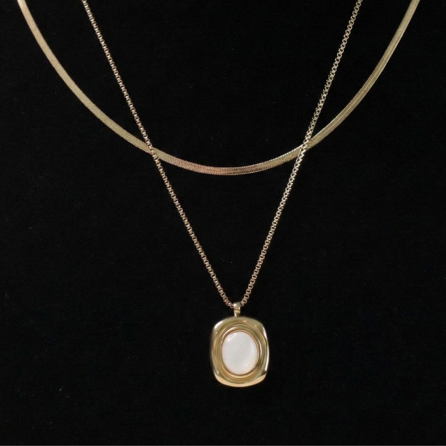 A sleek layered necklace featuring a smooth gold snake chain paired with a delicate neck chain. The soft white stone centerpiece adds a touch of modern elegance.