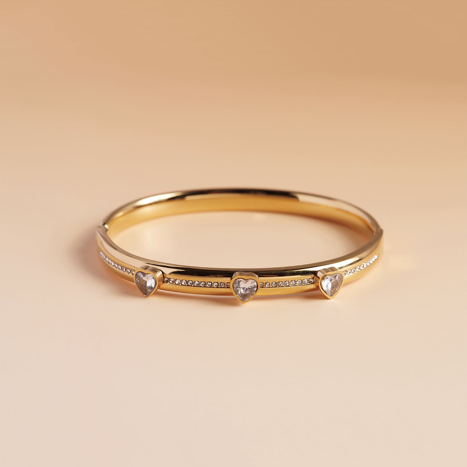 Graceful and luminous, the Heart Crystal Gold Bracelet features a polished gold-tone design adorned with sparkling crystal accents shaped into a refined heart motif. Subtle yet eye-catching, it brings a soft glow and timeless elegance to both everyday wear and special occasions.