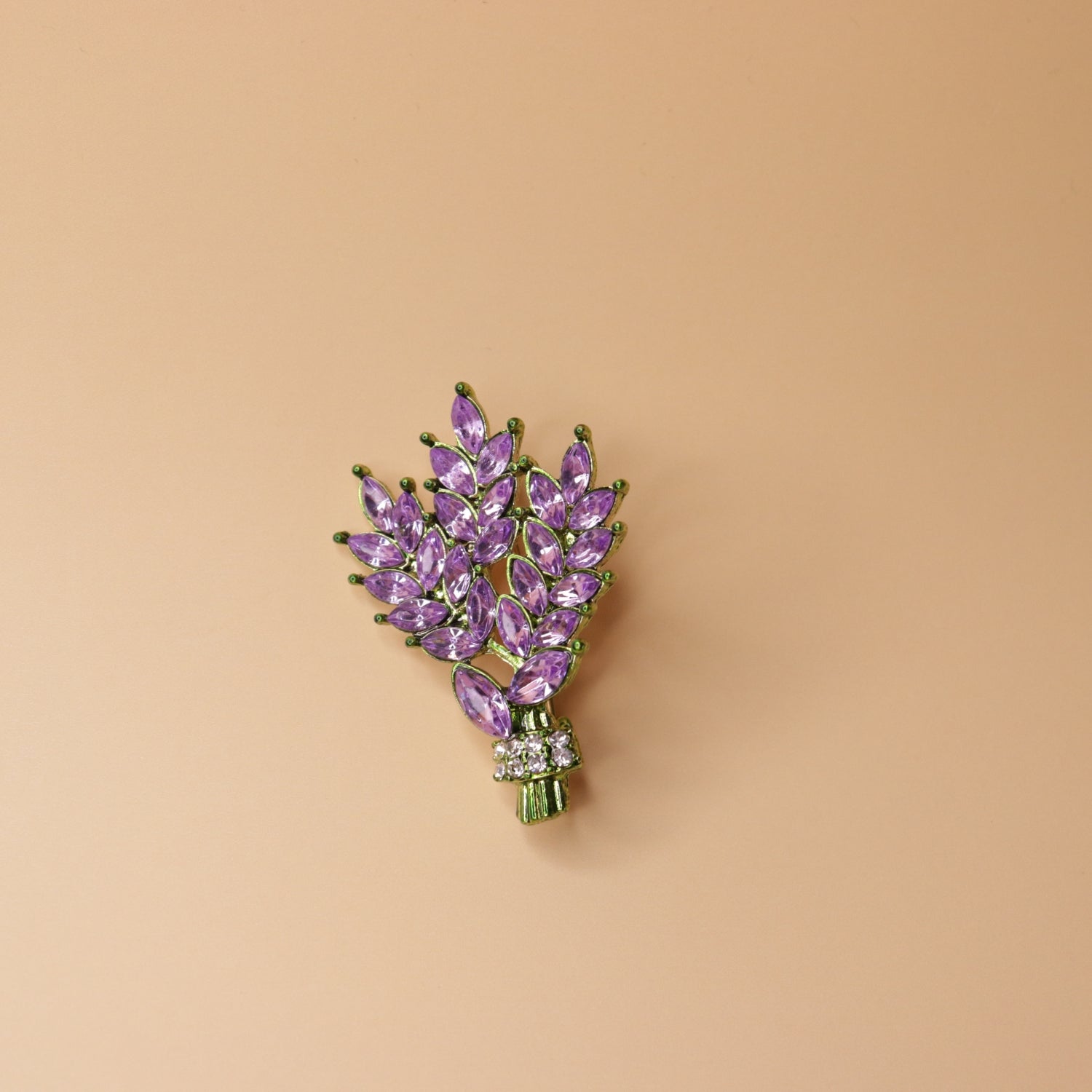 Inspired by a fresh bundle of wildflowers, this elegant brooch showcases marquise-cut violet crystals arranged like delicate petals in a rich antique-green setting. A sparkling band of clear micro-crystals gracefully ties the floral sprig, adding refined shimmer and depth. Perfect for blazers, scarves, or evening wear, it brings a vivid garden-inspired charm to any look.