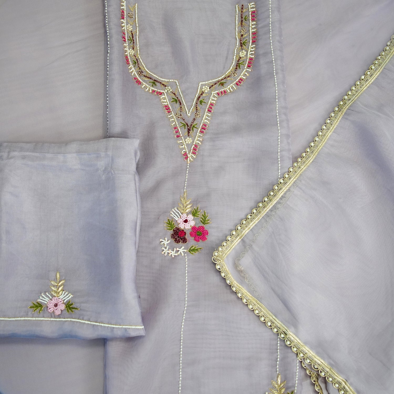 Lightweight lavender-grey organza kameez with intricate Zardosi and Aari embroidery in gold, accented with pearls and hand-embroidered pink floral motifs. Vertical pearl detailing adds elegance, paired with a scalloped gold- and pearl-edged dupatta.