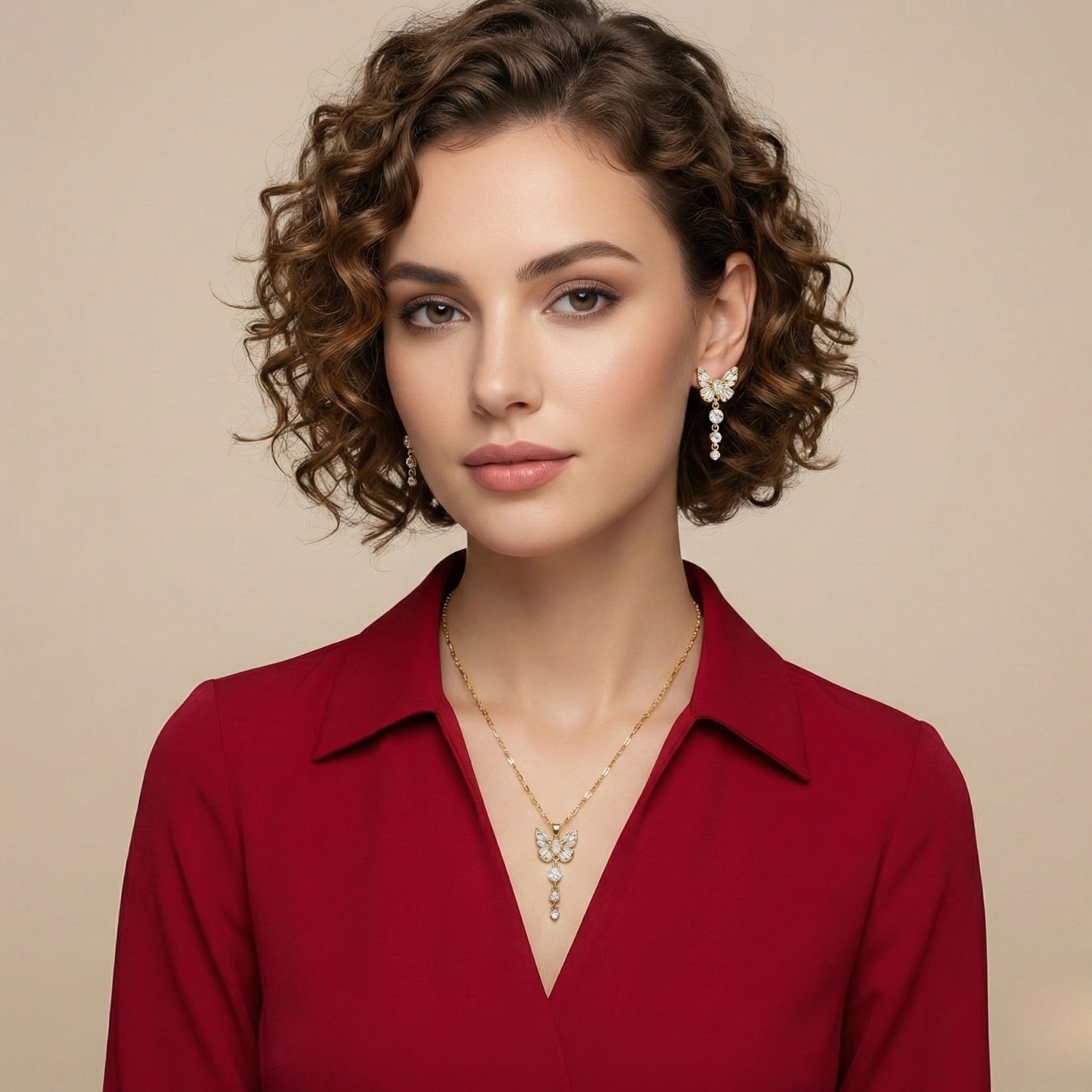 Embrace delicate sophistication with this enchanting crystal butterfly jewelry set, featuring a matching necklace and drop earrings in a radiant gold-tone finish. The butterfly motif is encrusted with sparkling clear stones, accented by cascading crystal drops that shimmer with every movement.