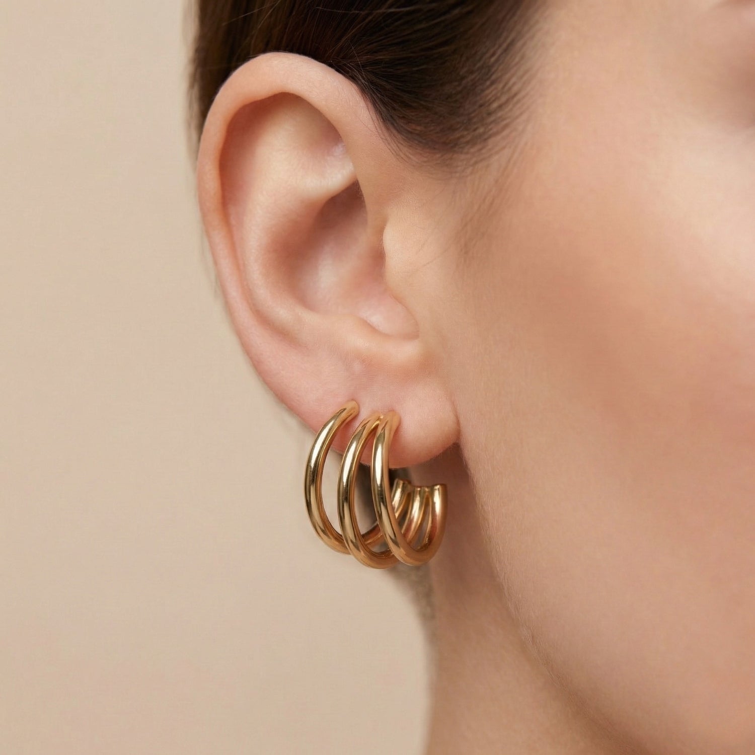 Designed for the modern minimalist, the Luxe Curve Triple Earrings combine three flowing gold bands into one elegant silhouette. Lightweight and radiant, they add instant polish to both casual and formal styles.