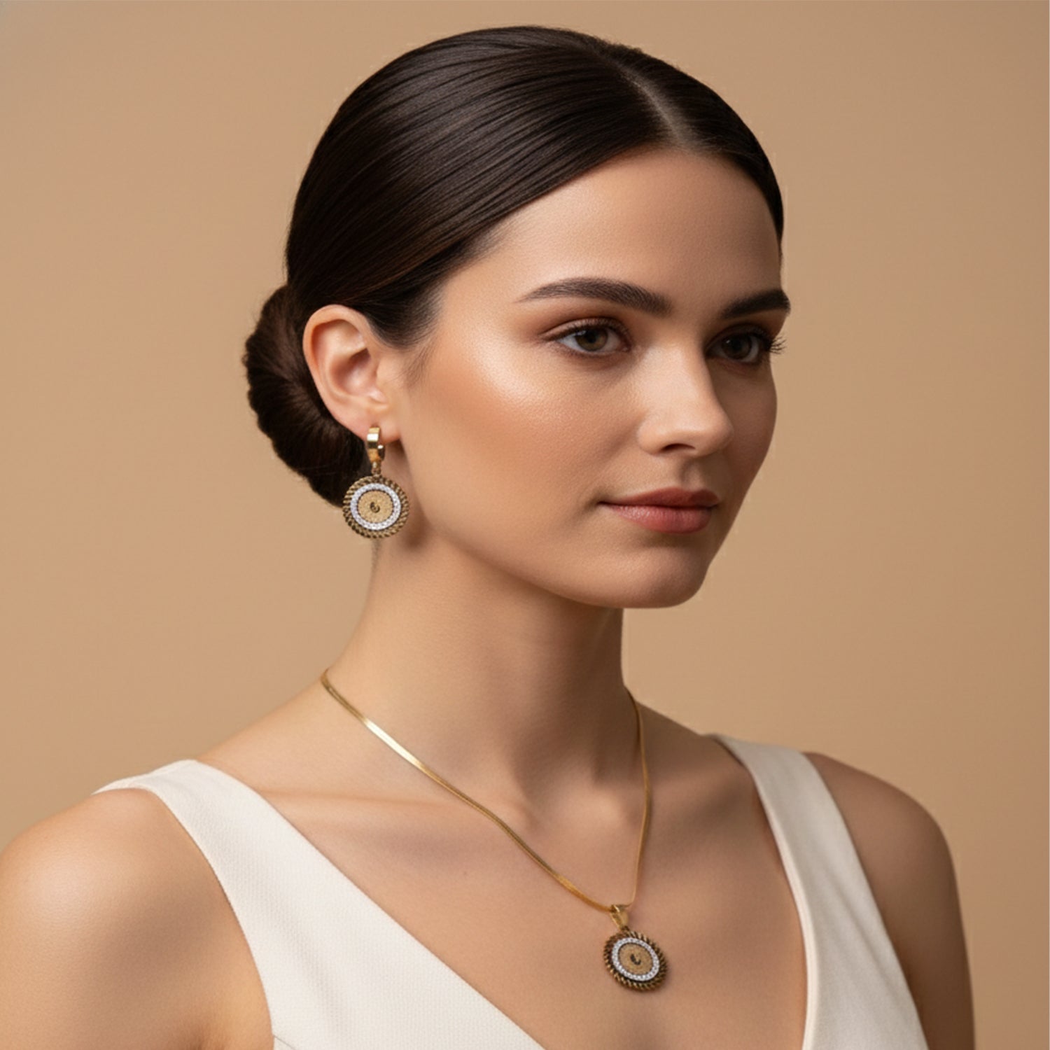 An expression of timeless elegance, this set features radiant gold tones accented with delicate crystal details. Designed to reflect refined sophistication, it adds a graceful glow to both special occasions and elevated everyday looks.