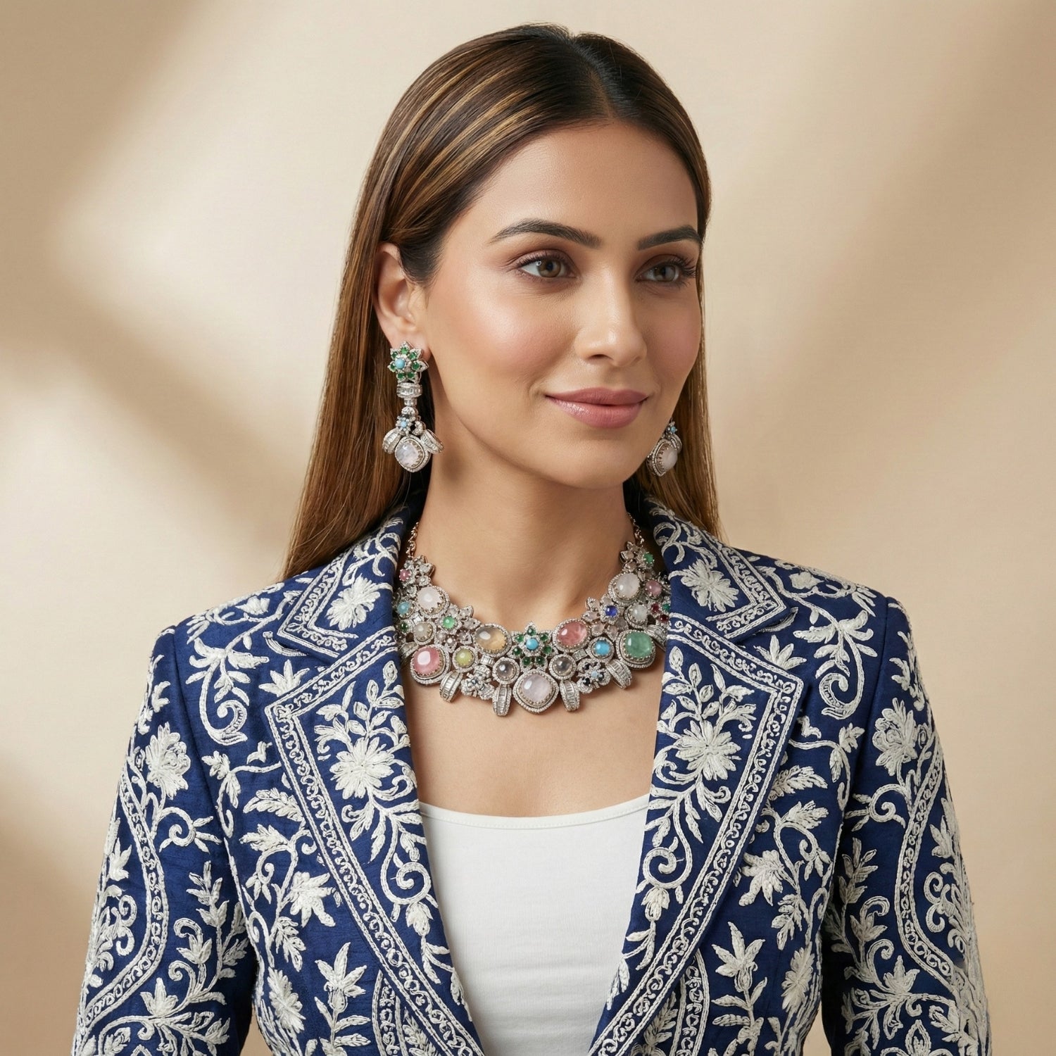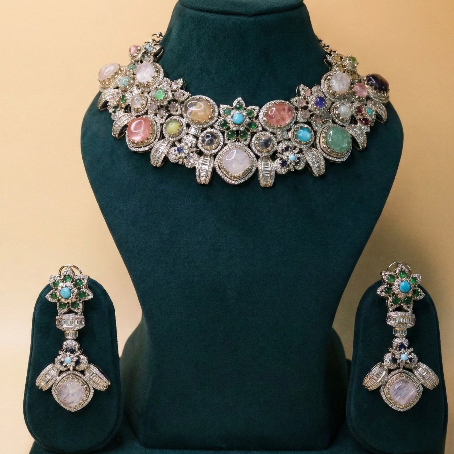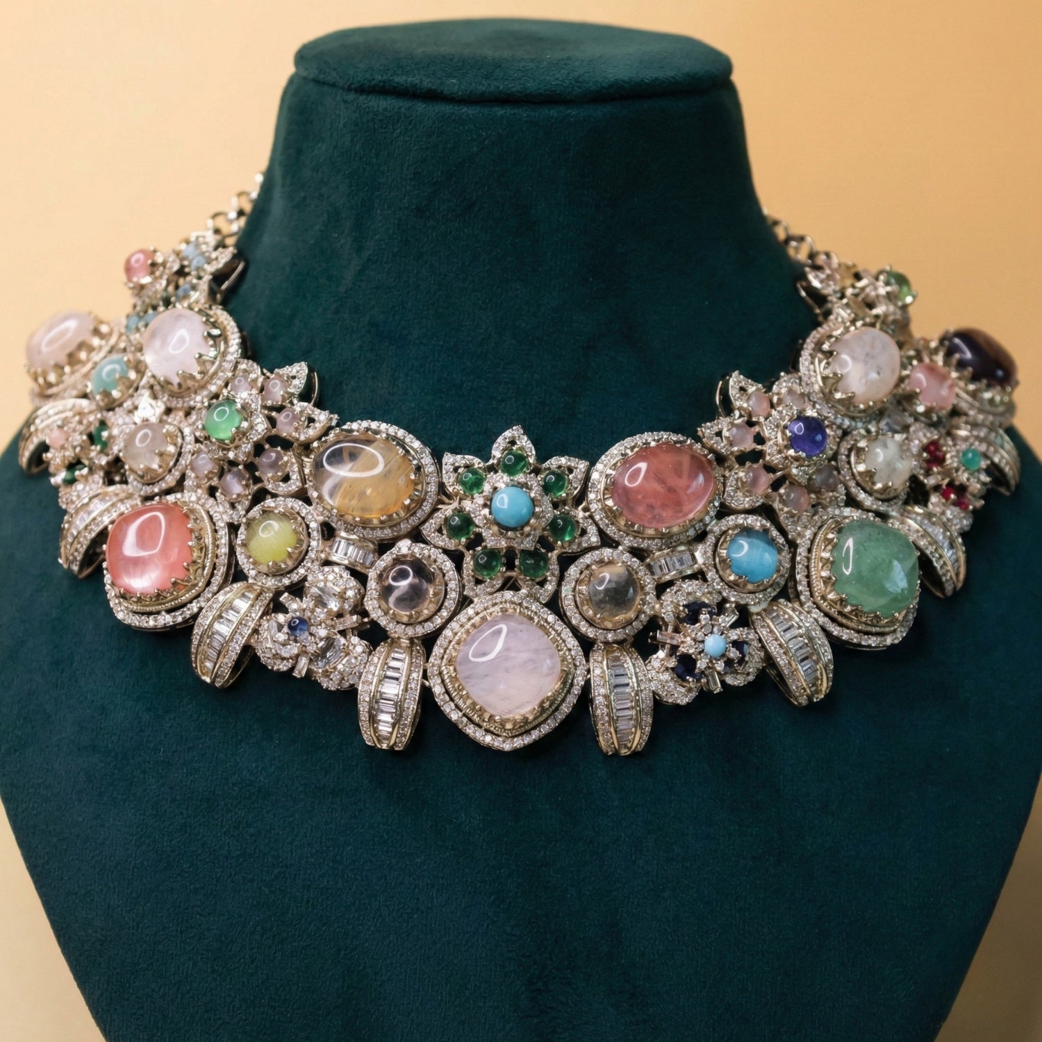 A captivating mosaic of floral forms and crescent elements, where soft pastel gemstones meet radiant sparkle. The design reflects warmth (mehr), grace, and timeless elegance, perfect for a statement luxury look.