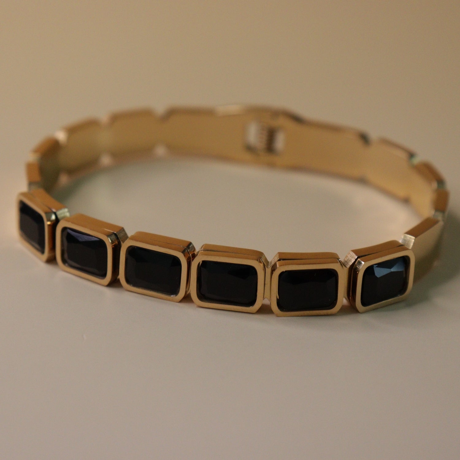 Designed with striking black gemstone panels framed in radiant gold, this bracelet offers a refined yet contemporary look. The clean rectangular design adds a touch of elegance and confidence to any outfit.