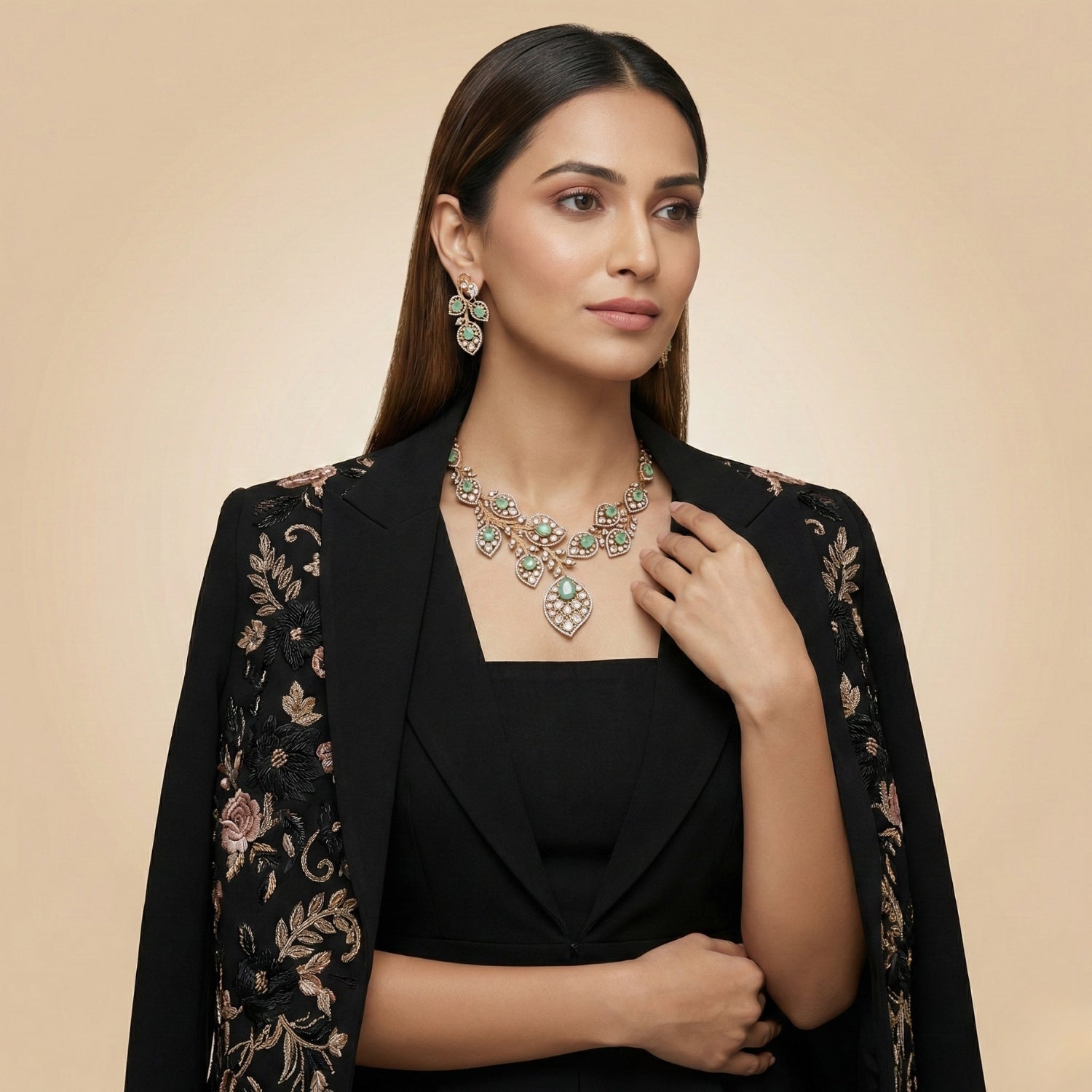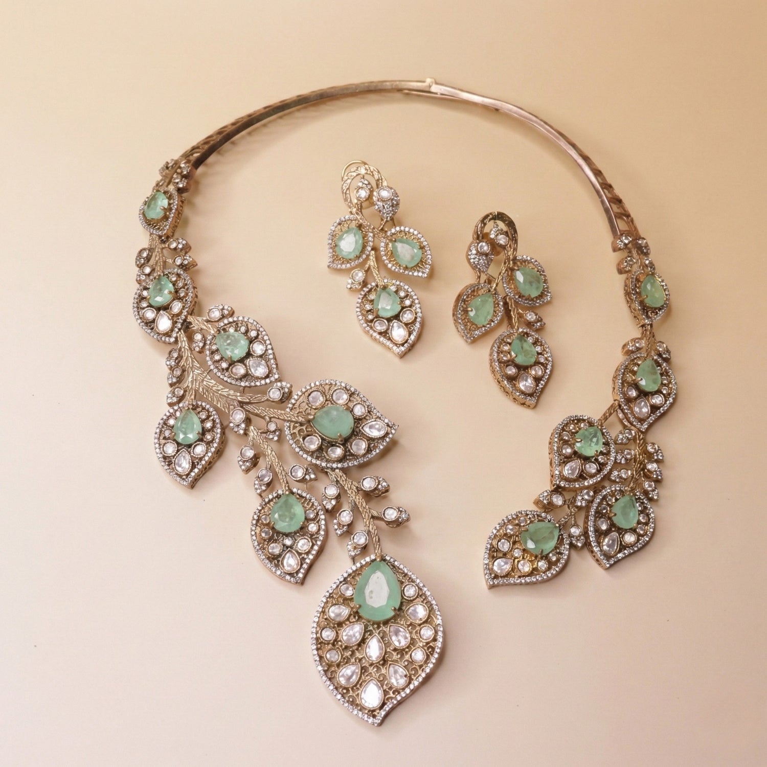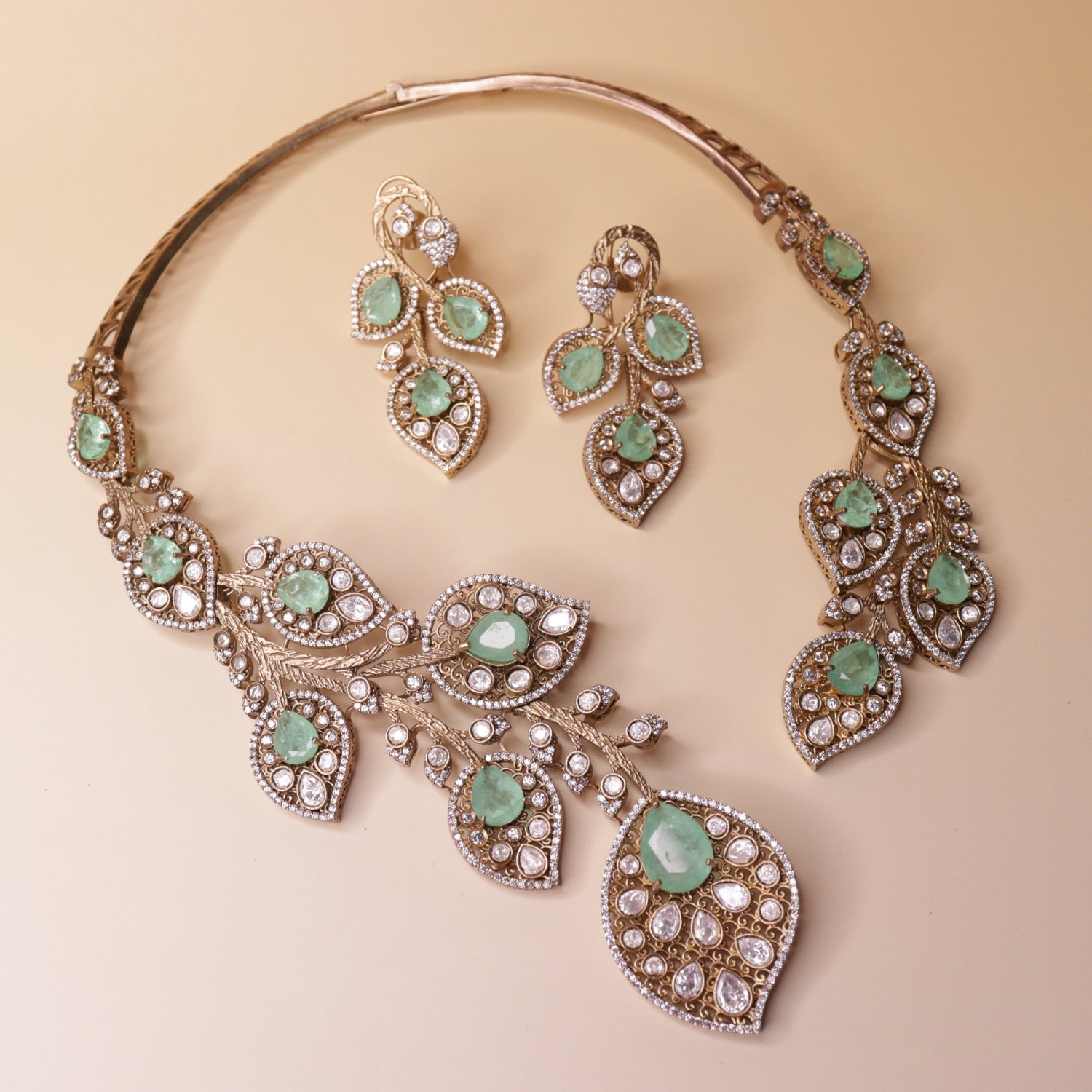 The Mint Blossom Set blends tradition with freshness through delicate floral motifs and soothing mint hues. Adorned with mint-toned green stones and American diamond detailing, it reflects refined craftsmanship. A timeless and elegant choice that adds a soft, refreshing charm to any festive look.