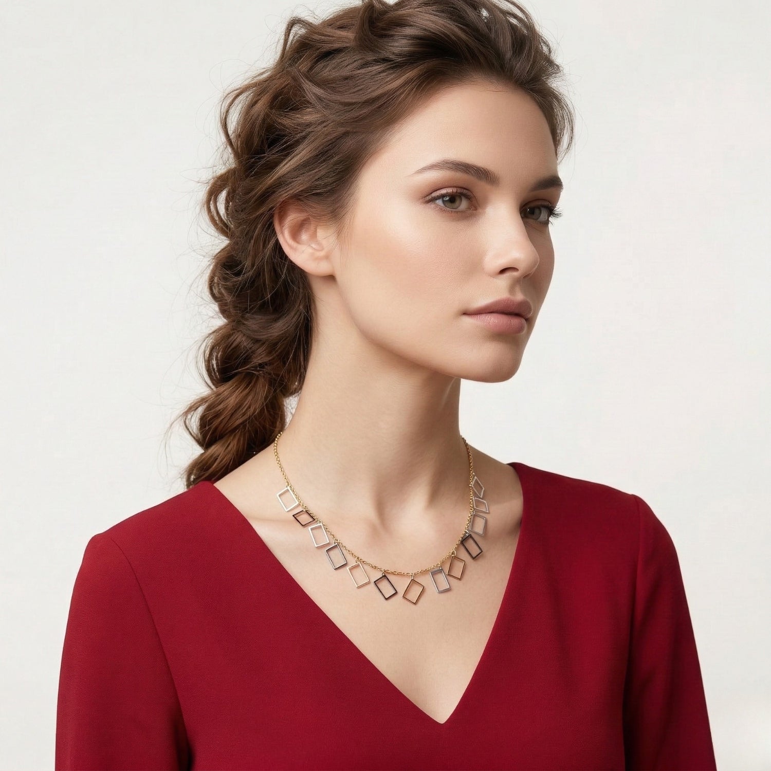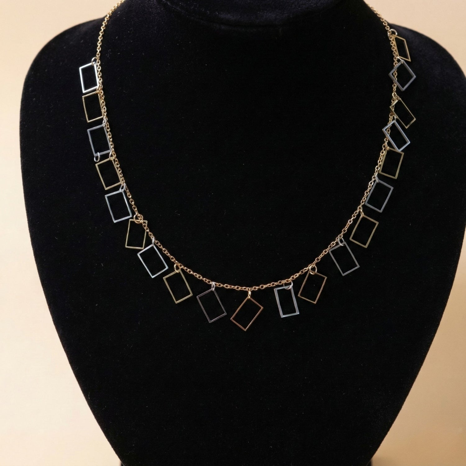 A delicate gold-tone chain adorned with a series of sleek open rectangular charms that create a stylish geometric pattern. The alternating metallic tones add a subtle contrast, giving the necklace a contemporary and elegant appeal. Perfect for layering or wearing alone as a refined statement piece.