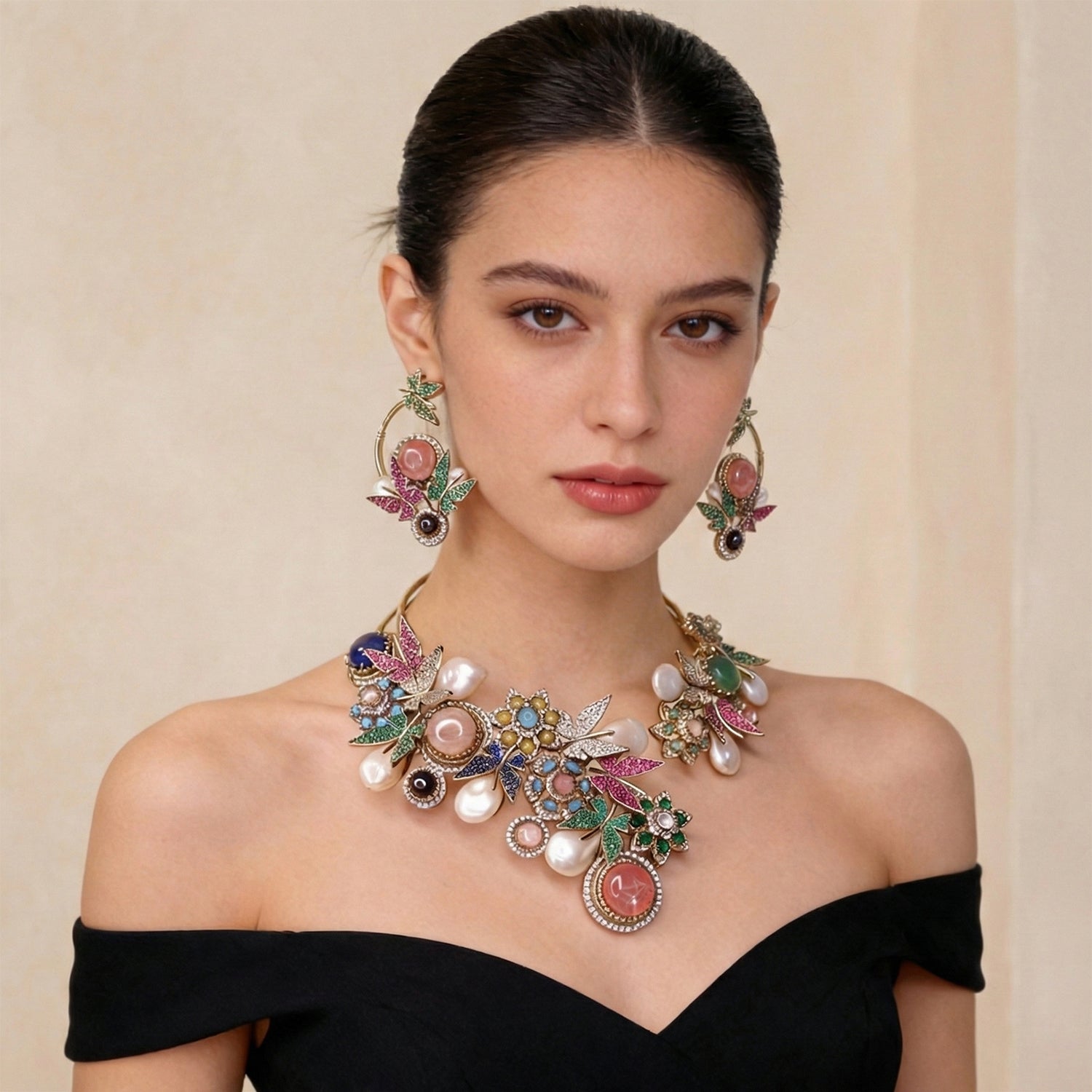 A timeless blend of quartz stones, natural pearls, and accent stones, this antique-finish set is crafted on a gold-toned alloy base and exudes heritage charm. Every element comes together to create a regal statement piece with classic elegance.