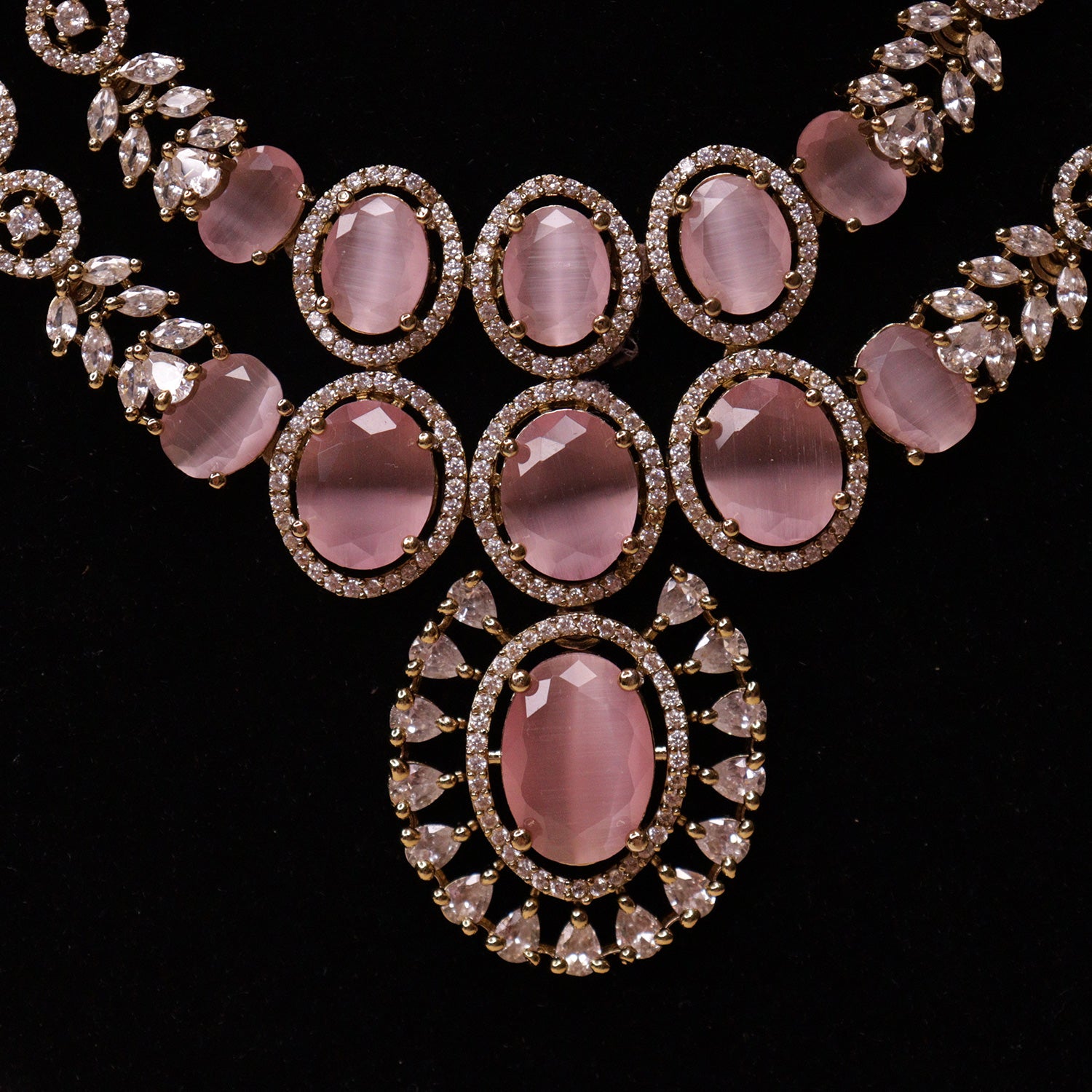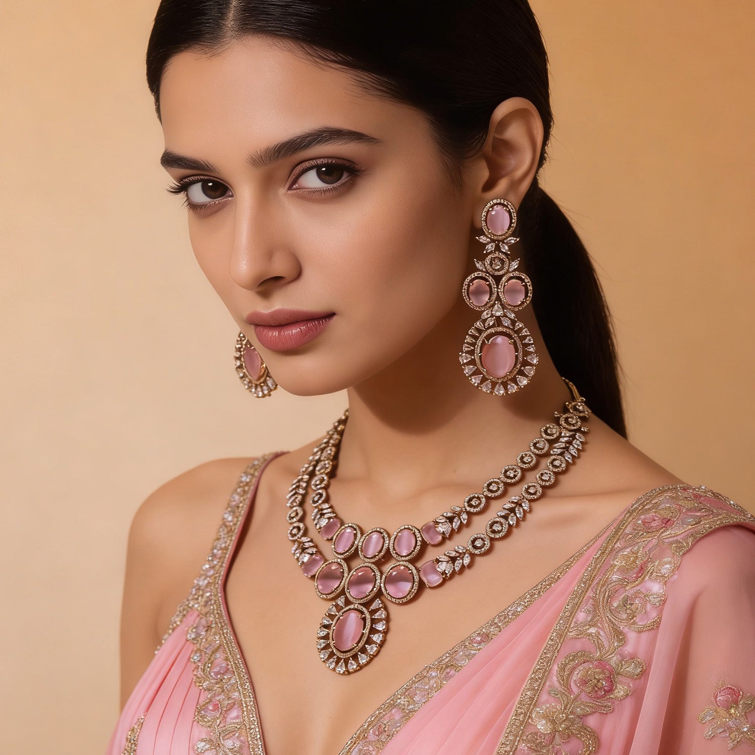 The set includes a double-layer necklace and long dangling earrings designed with elegant pink oval-shaped stones. The stones are surrounded by small white diamond-like crystals arranged in floral and leaf-style patterns, giving the set a rich and royal look.