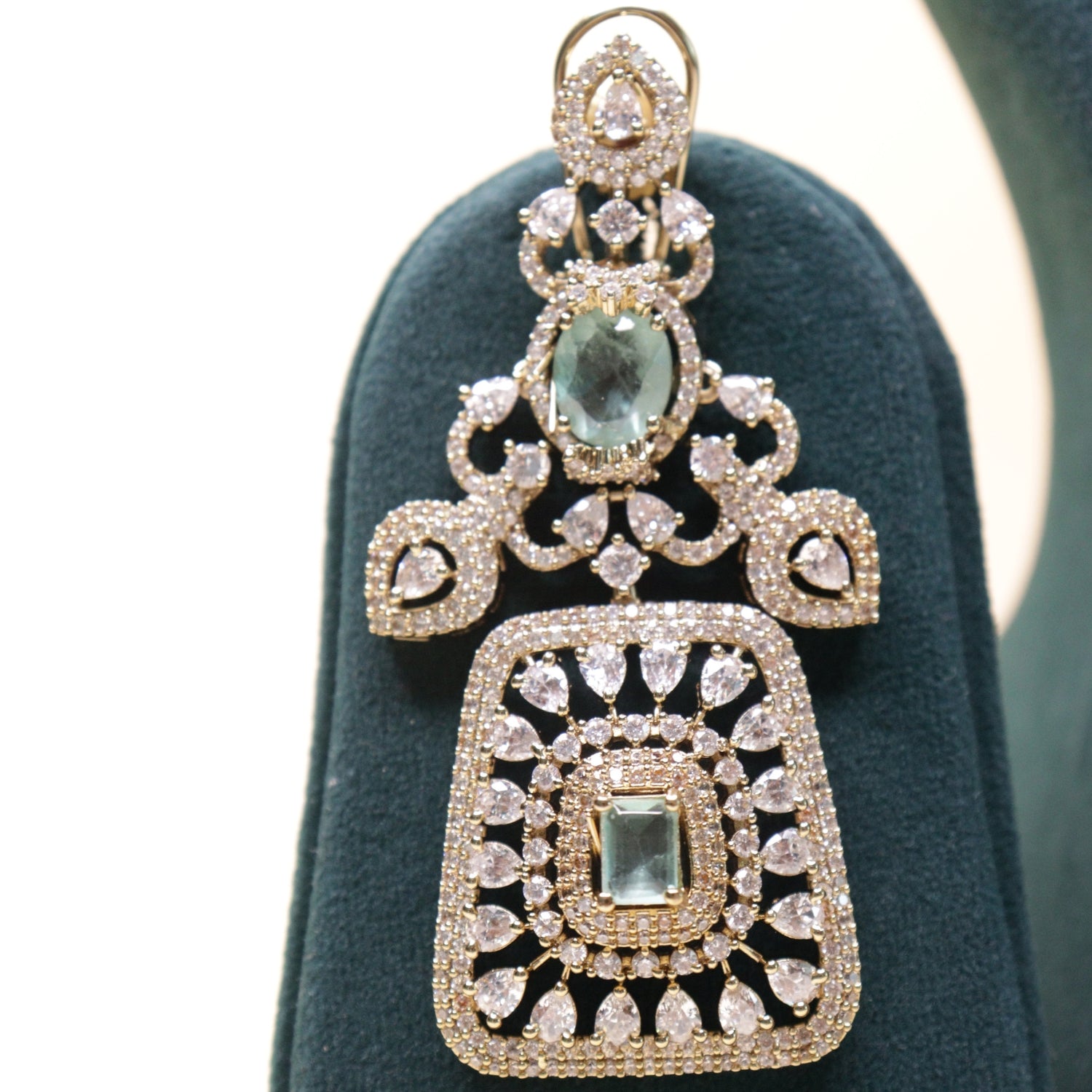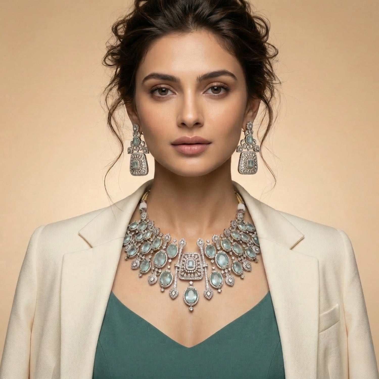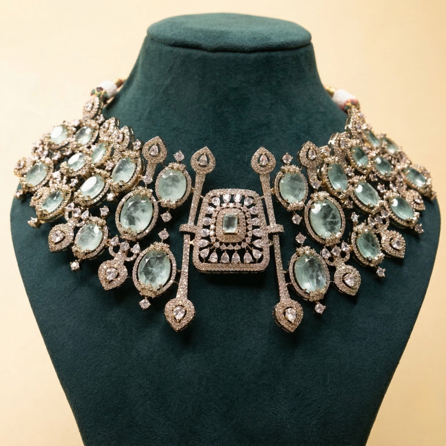 A breathtaking choker set adorned with luminous pastel gemstones, intricately framed by shimmering diamond artistry. The cascading design reflects regal Mughal grandeur, with delicate motifs creating a graceful, royal silhouette. Paired with statement earrings, this set embodies timeless elegance and refined luxury for grand occasions.