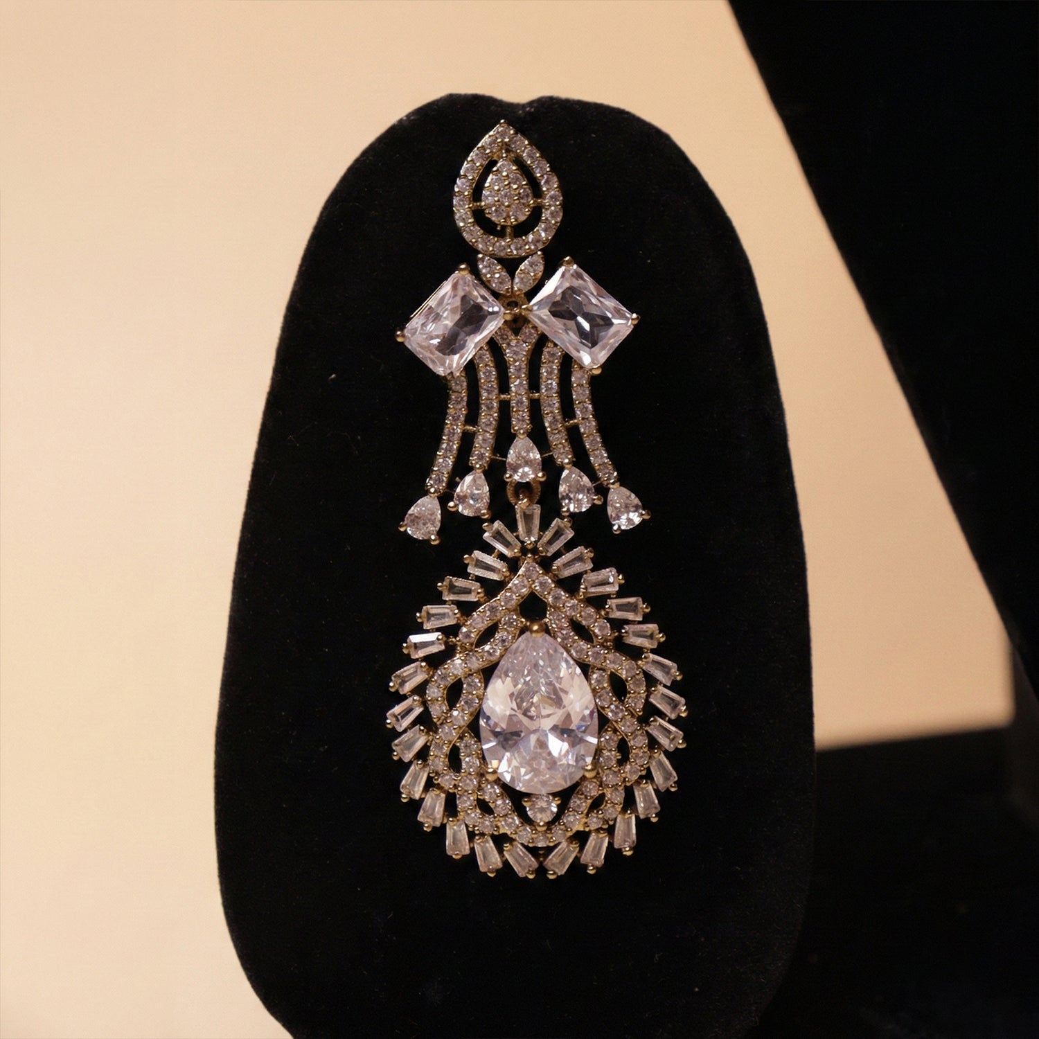 This is a dazzling and luxurious jewellery set featuring an intricately designed necklace with matching statement earrings and maang tikka. The set is adorned with sparkling stones arranged in elegant layered patterns with teardrop center pieces that enhance its royal charm.