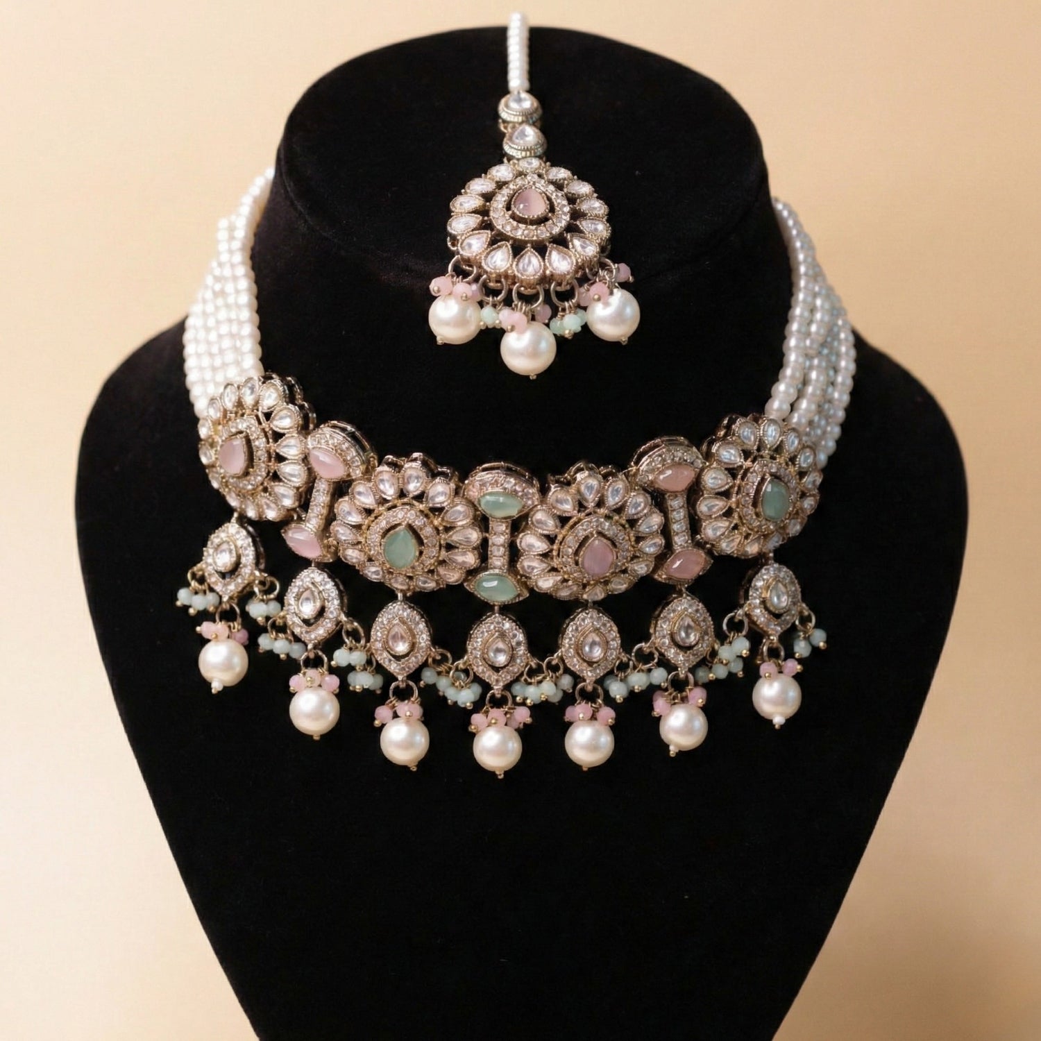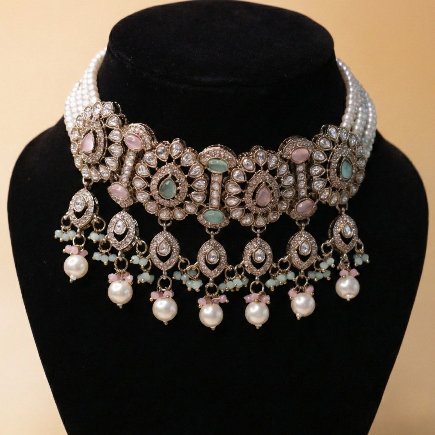 This luxurious choker-style set showcases pastel pink and green stones framed by radiant AD crystals. Designed with intricate metalwork on an antique gold–finished brass base, it is enriched with pearl hangings for graceful movement.