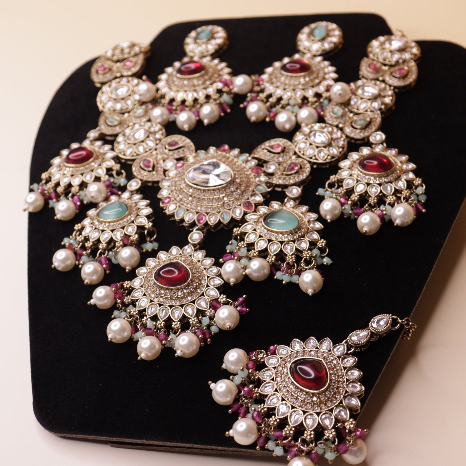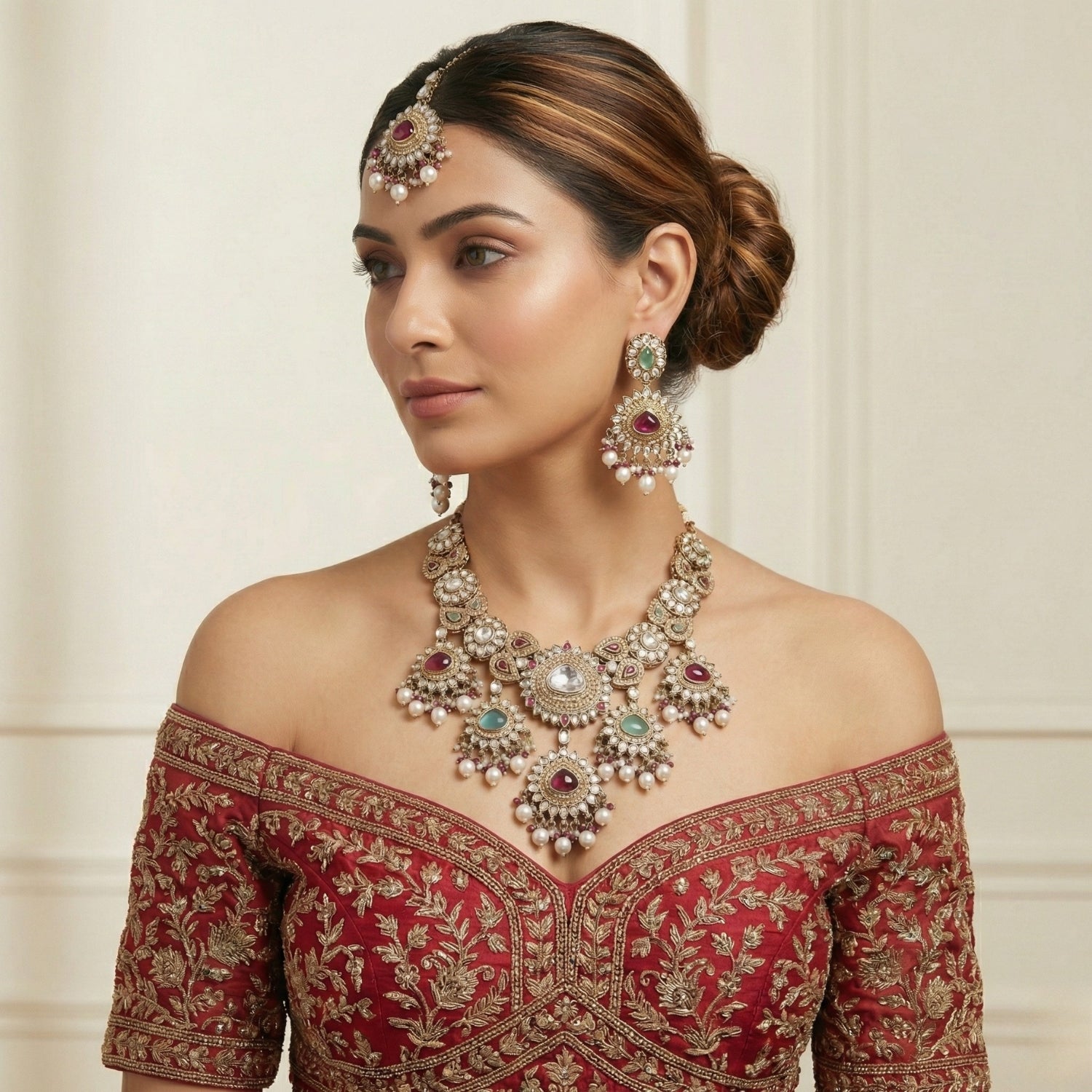 A regal Kundan set featuring Polki-style stones with multicolored jade and ruby accents, enhanced by delicate meenakari detailing. Finished with antique dual-tone plating and natural pearls hangings for a rich, statement look.