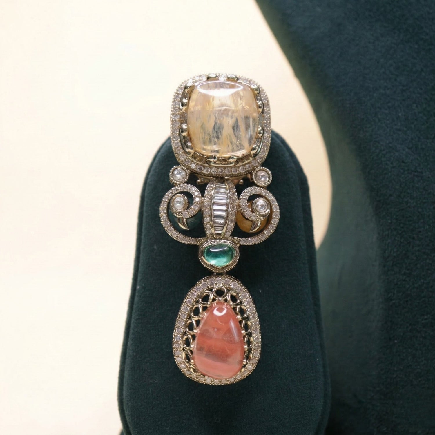 Material: Rose Quartz, Antique-finish silver alloy, Framed by pave diamonds.etc.