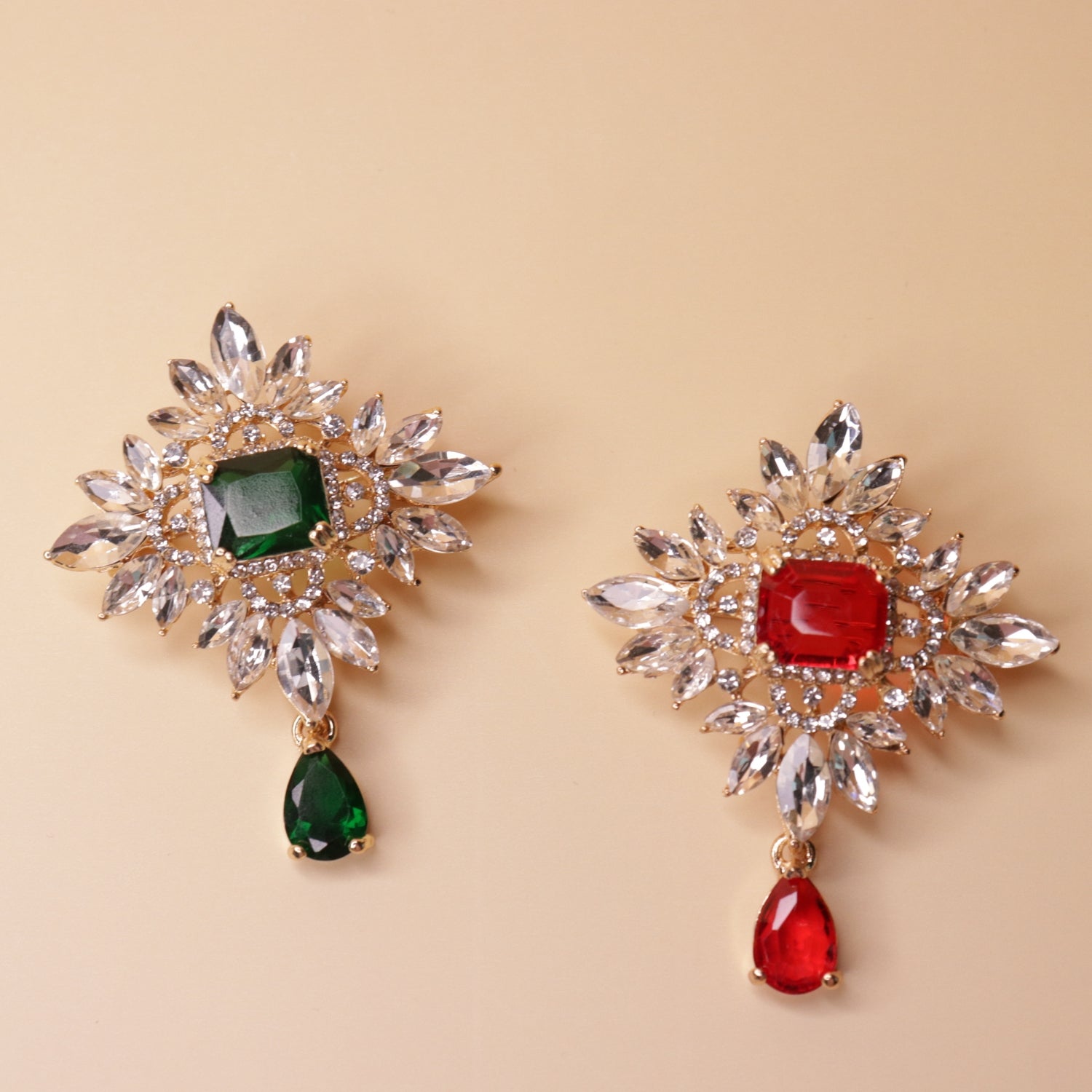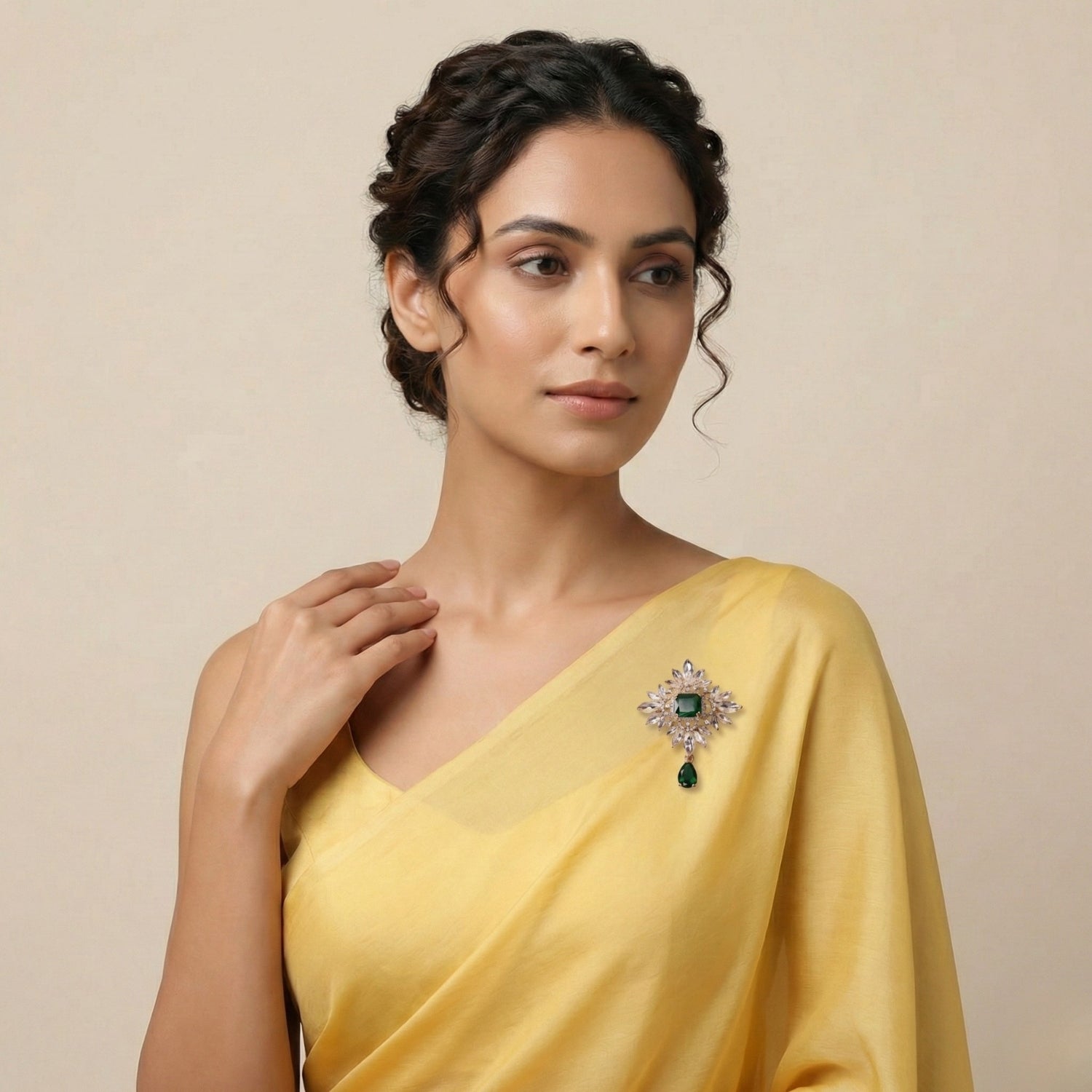 The Radiant Royale Brooch exudes timeless elegance with its gold-tone base and striking emerald-green or ruby-red center stone. Framed by shimmering marquise-cut crystals and finished with a graceful teardrop drop, it adds refined sparkle and movement. Perfect for festive, ethnic, or evening wear, it blends vintage luxury with modern charm.