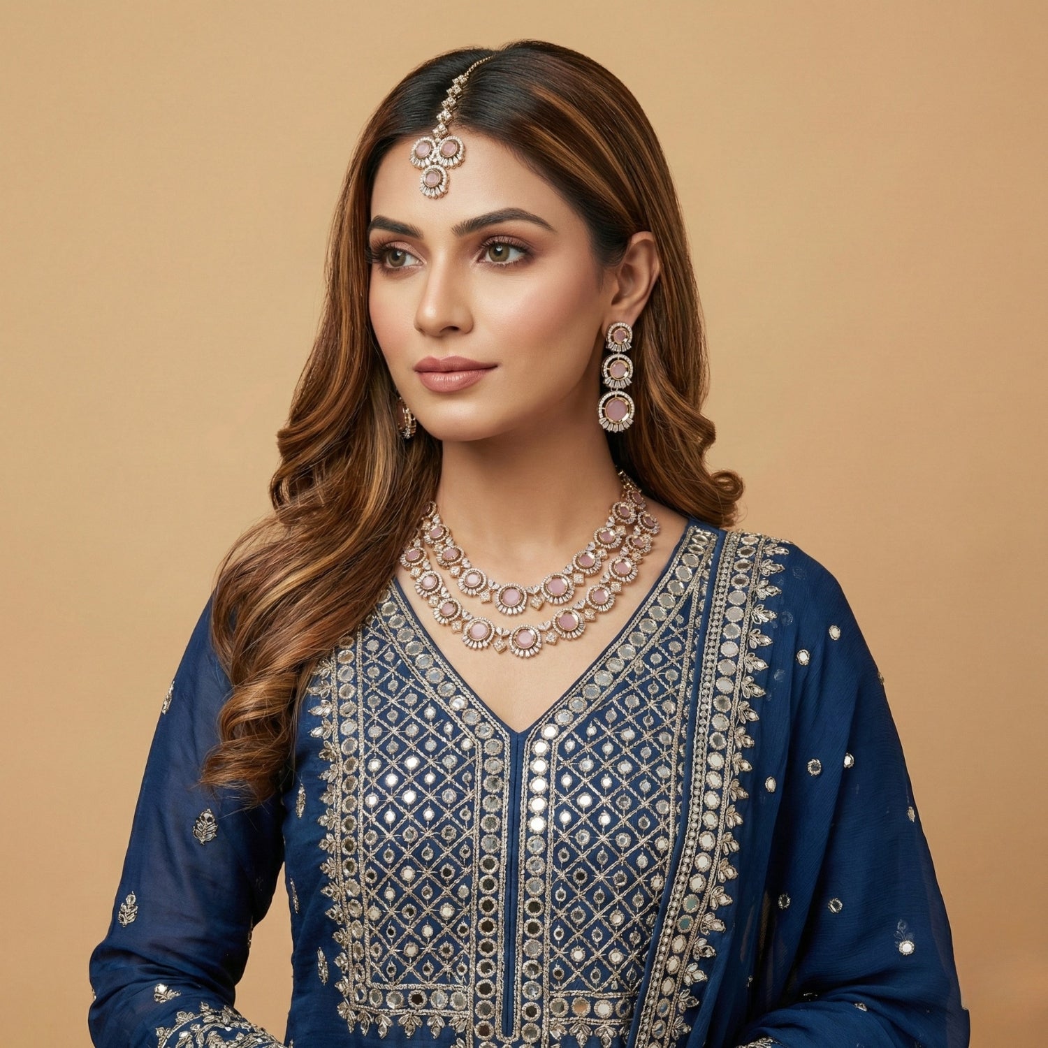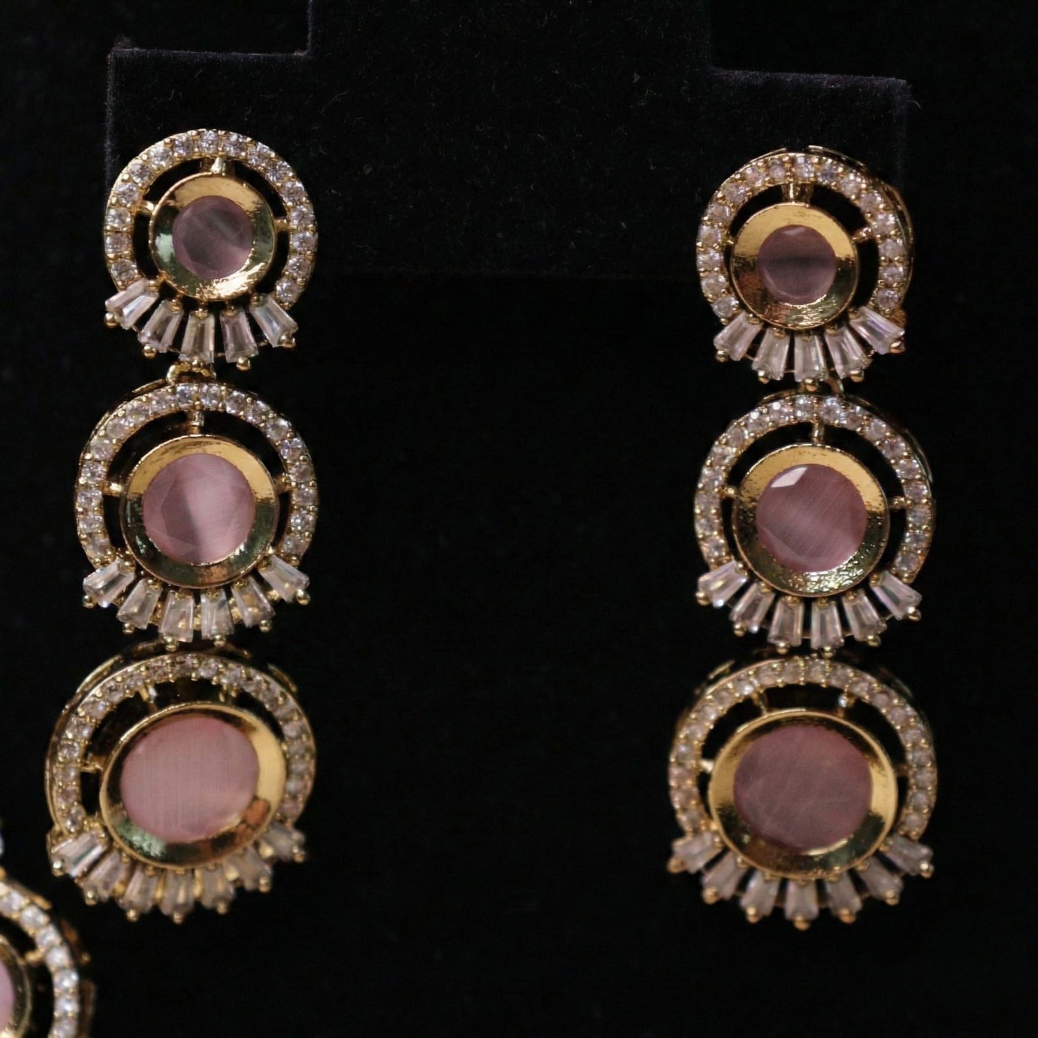 A luxurious layered bridal set featuring soft mauve stones framed by sparkling American Diamond halos. The double-strand necklace, matching dangle earrings, and Maang Tikka create a rich, coordinated look. Antique gold finishing enhances the pastel stones with timeless elegance.