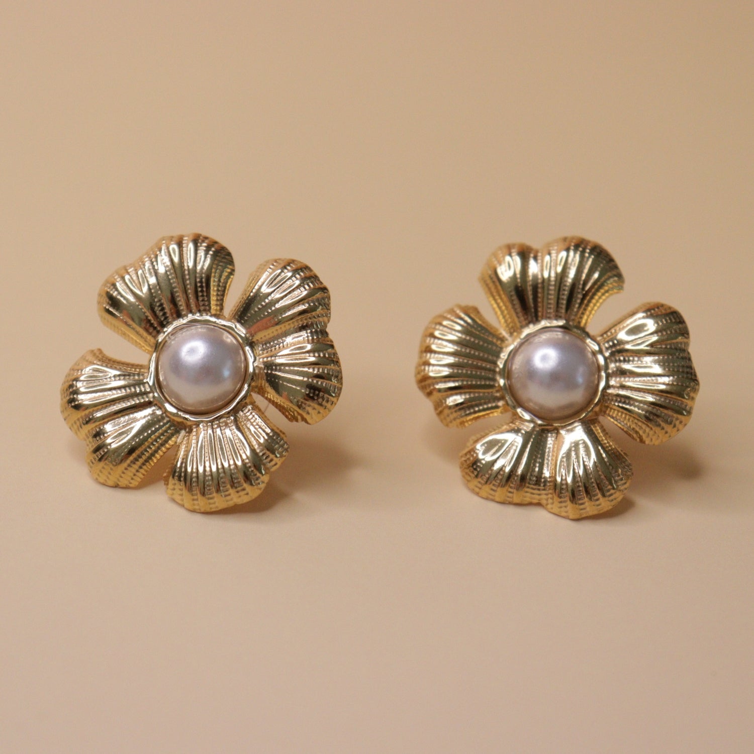 A graceful floral stud design crafted in polished gold-tone metal with finely ribbed petal detailing. At the center, a luminous white pearl adds soft elegance and timeless charm. Perfectly balanced and refined, these studs elevate both everyday and occasion looks.