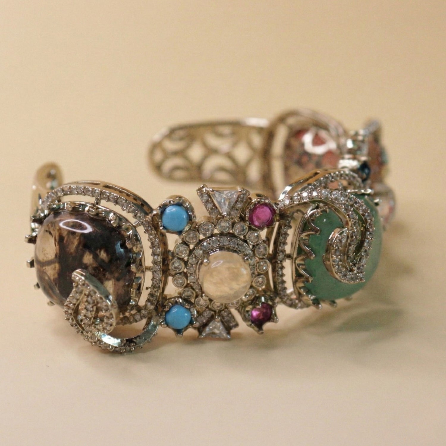 Inspired by royal courtyards and floral symmetry, this bangle showcases smooth polished stones surrounded by delicate crystal detailing, offering a refined yet powerful look.