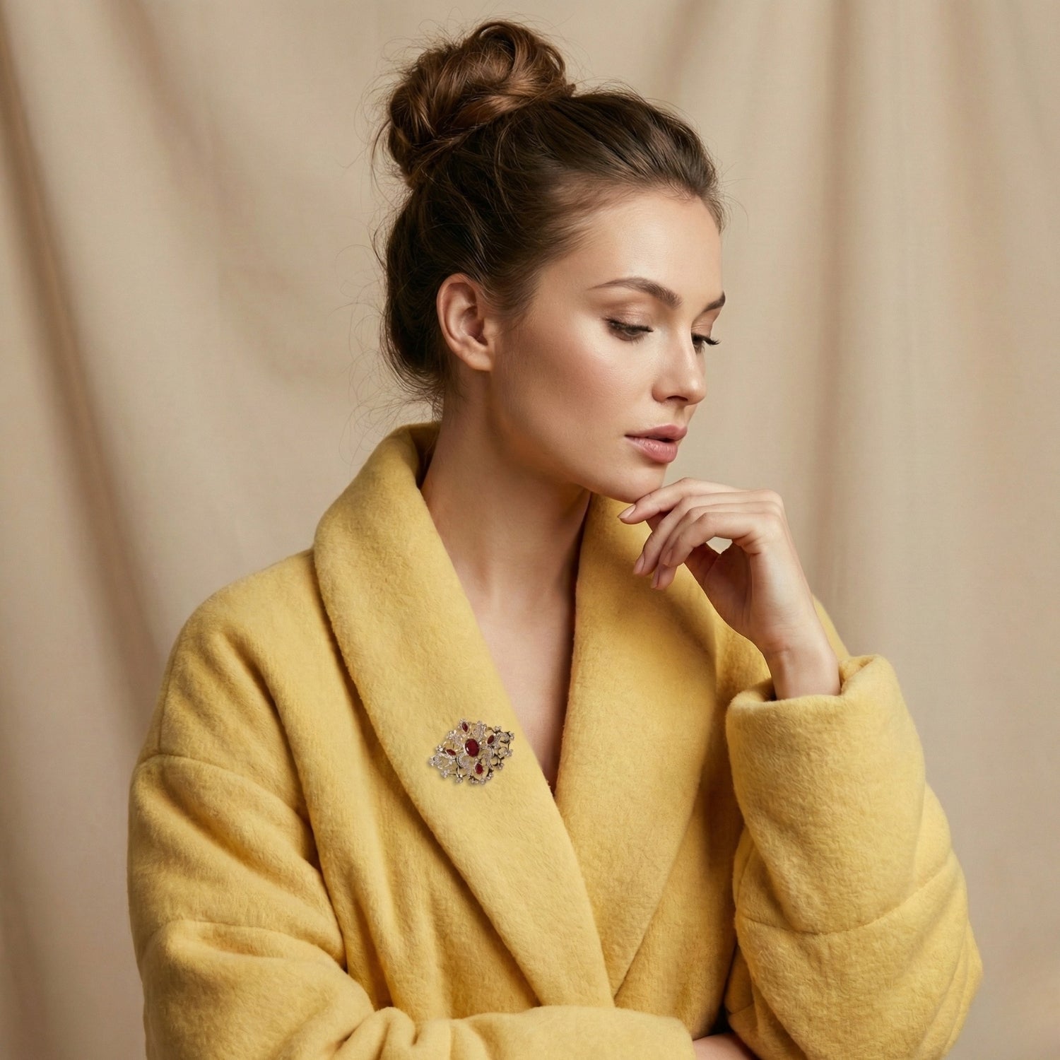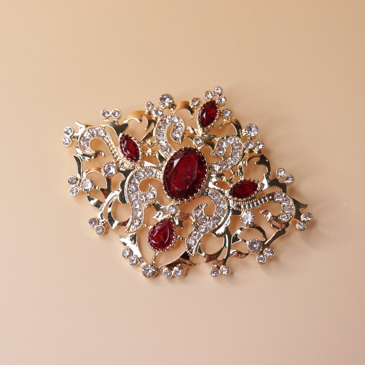 An opulent gold-toned brooch featuring intricate filigree scrollwork, richly adorned with deep crimson marquise and oval stones. Sparkling clear crystals trace the ornate curves, adding brilliance and refined contrast to the bold red center. A timeless statement piece that exudes royal elegance, perfect for formal wear, sarees, gowns etc.