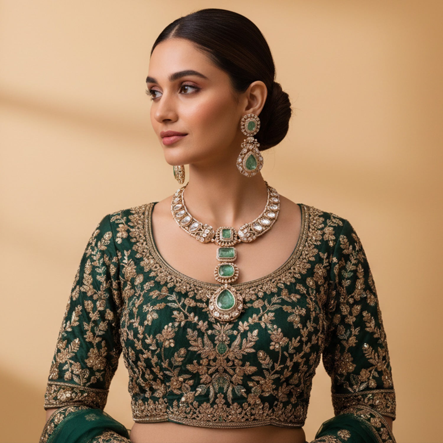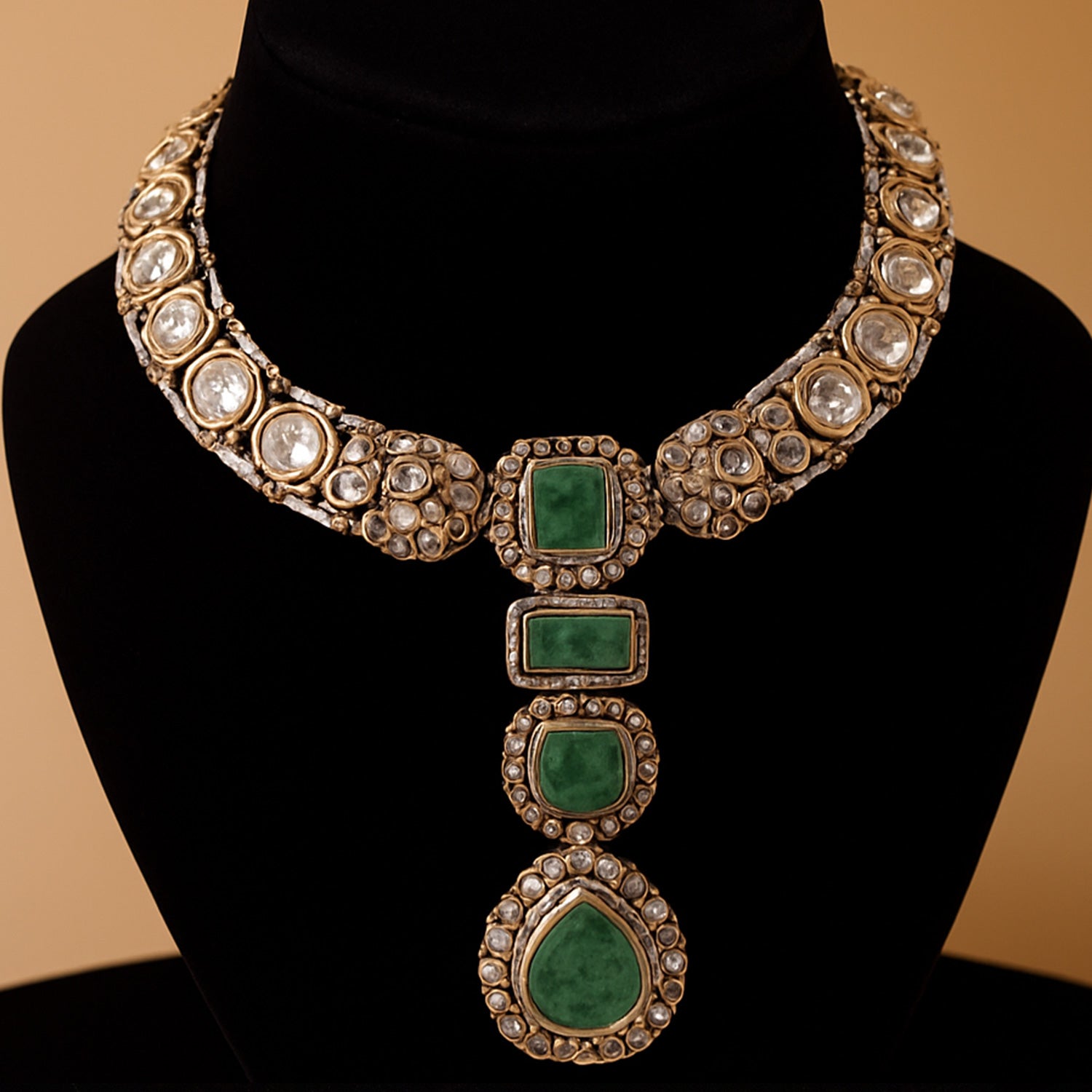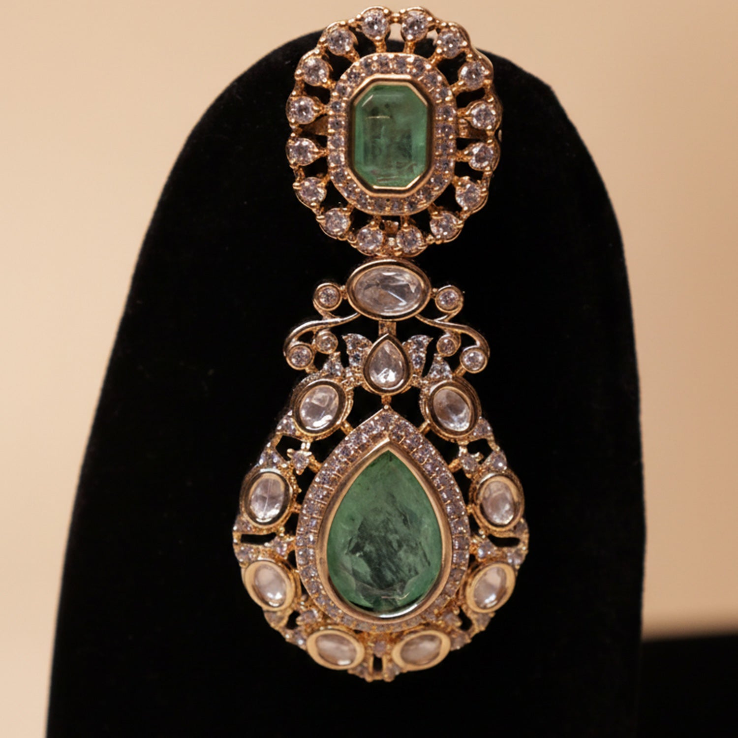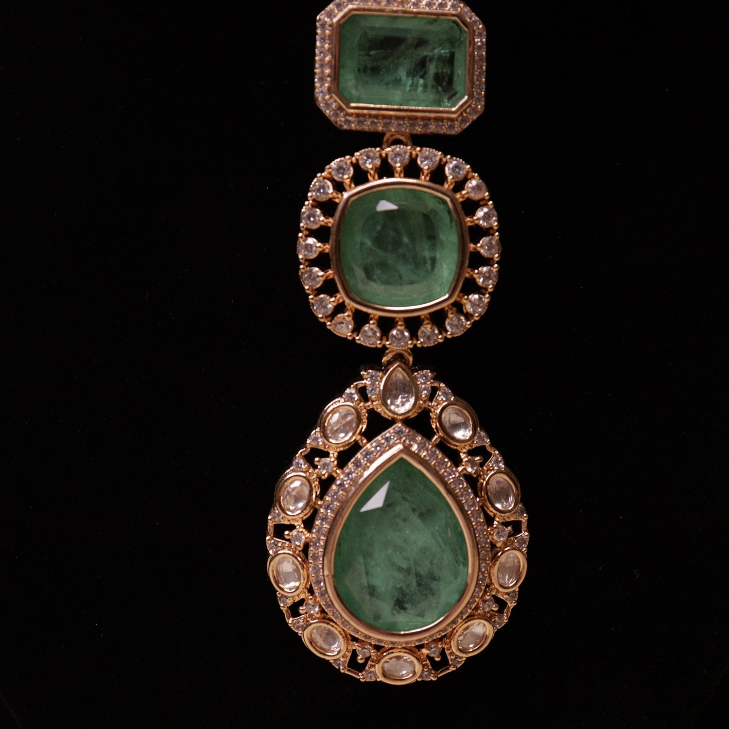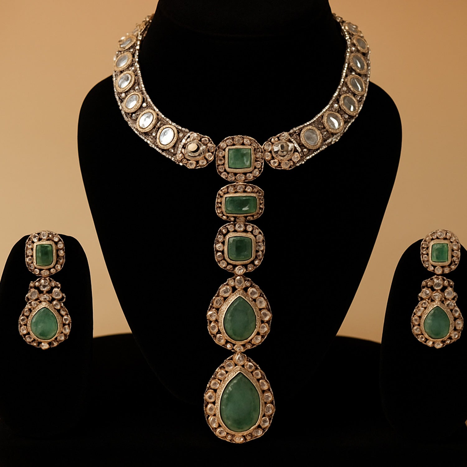 The necklace features oval and rectangular white crystal stones arranged in a detailed pattern, with three large green stones forming a layered pendant in the center. These green stones give the set a rich and royal appearance.