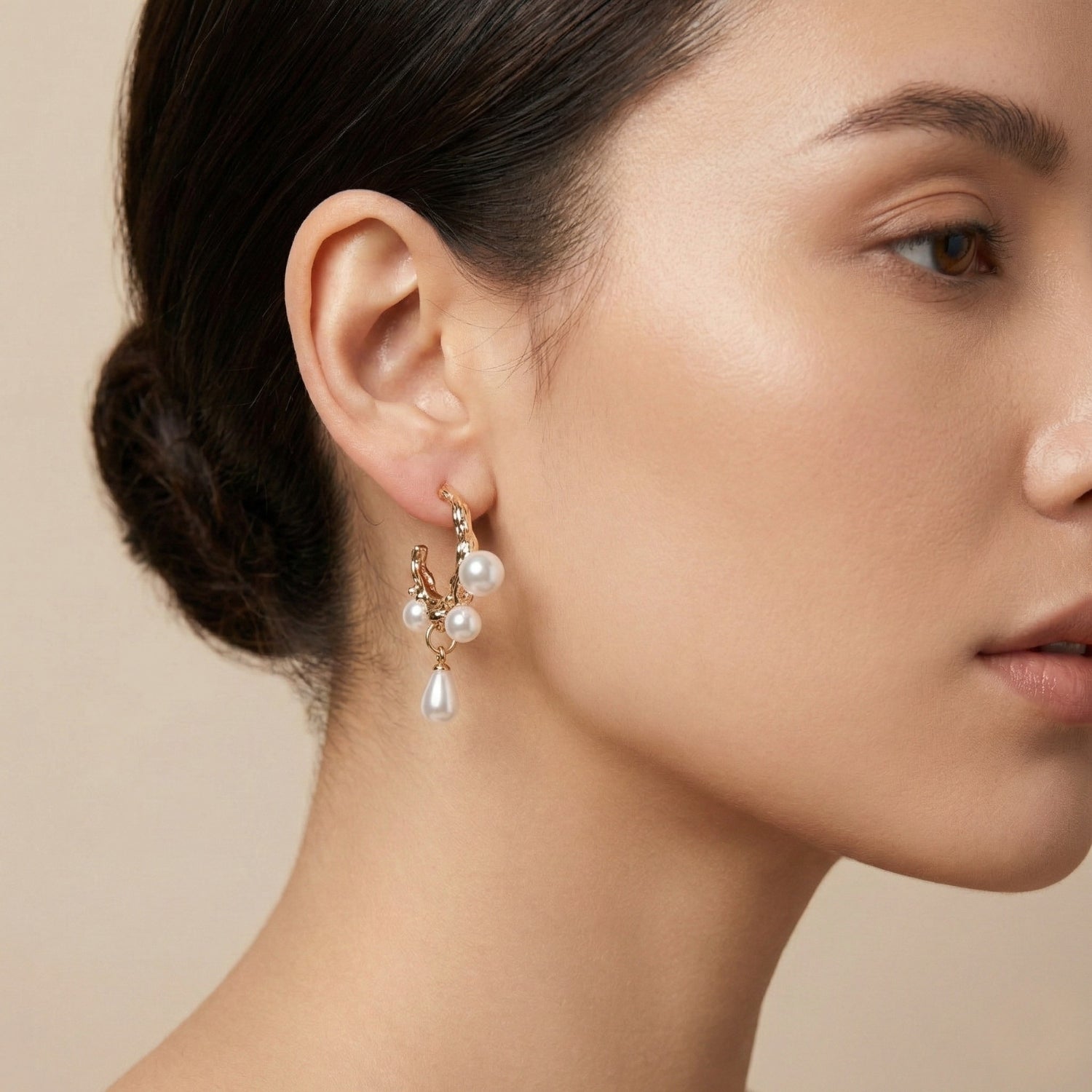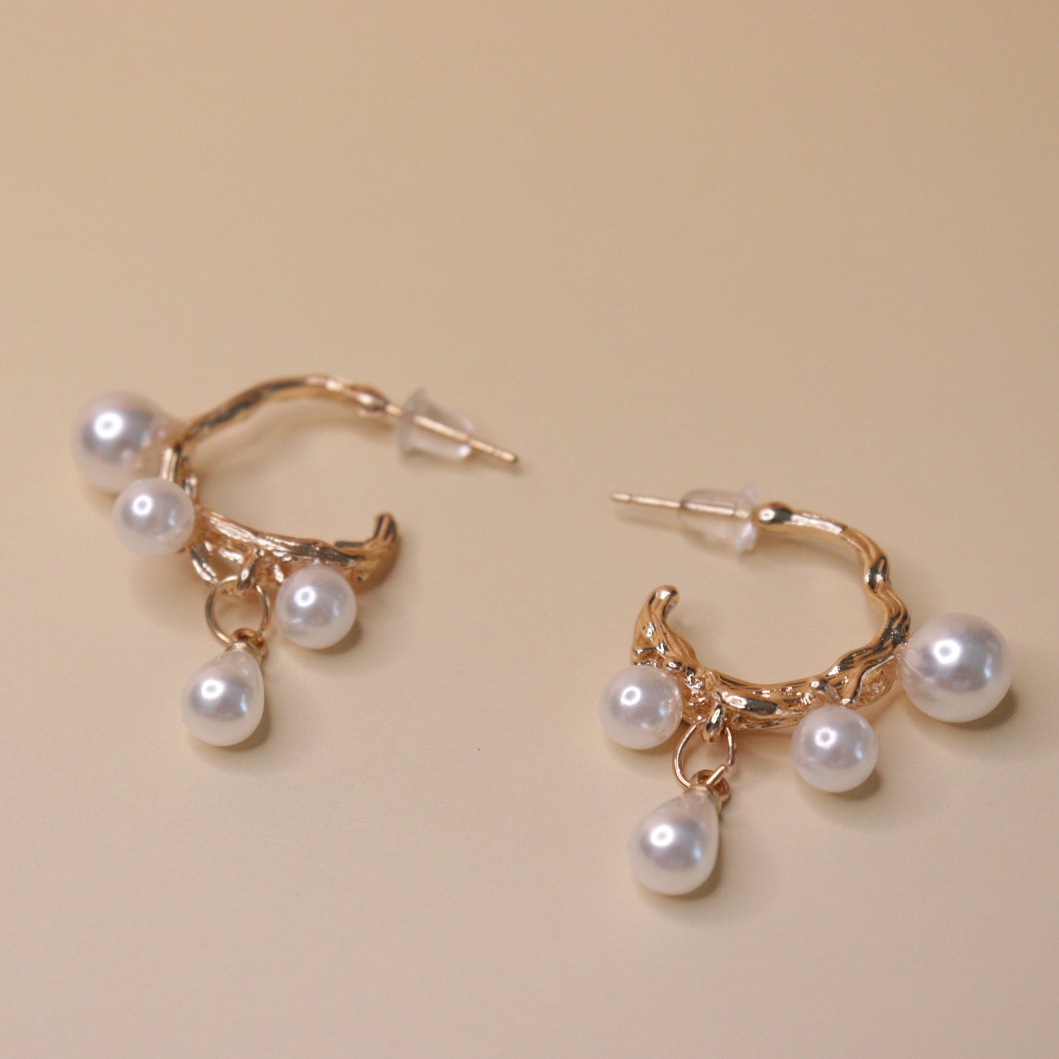 Warm gold textures paired with glossy white pearls. Designed with petite hanging pearls for a soft, luxurious finish. Dangling pearl drops create gentle movement and feminine appeal. Lightweight, elegant, and perfect for day-to-evening styling.