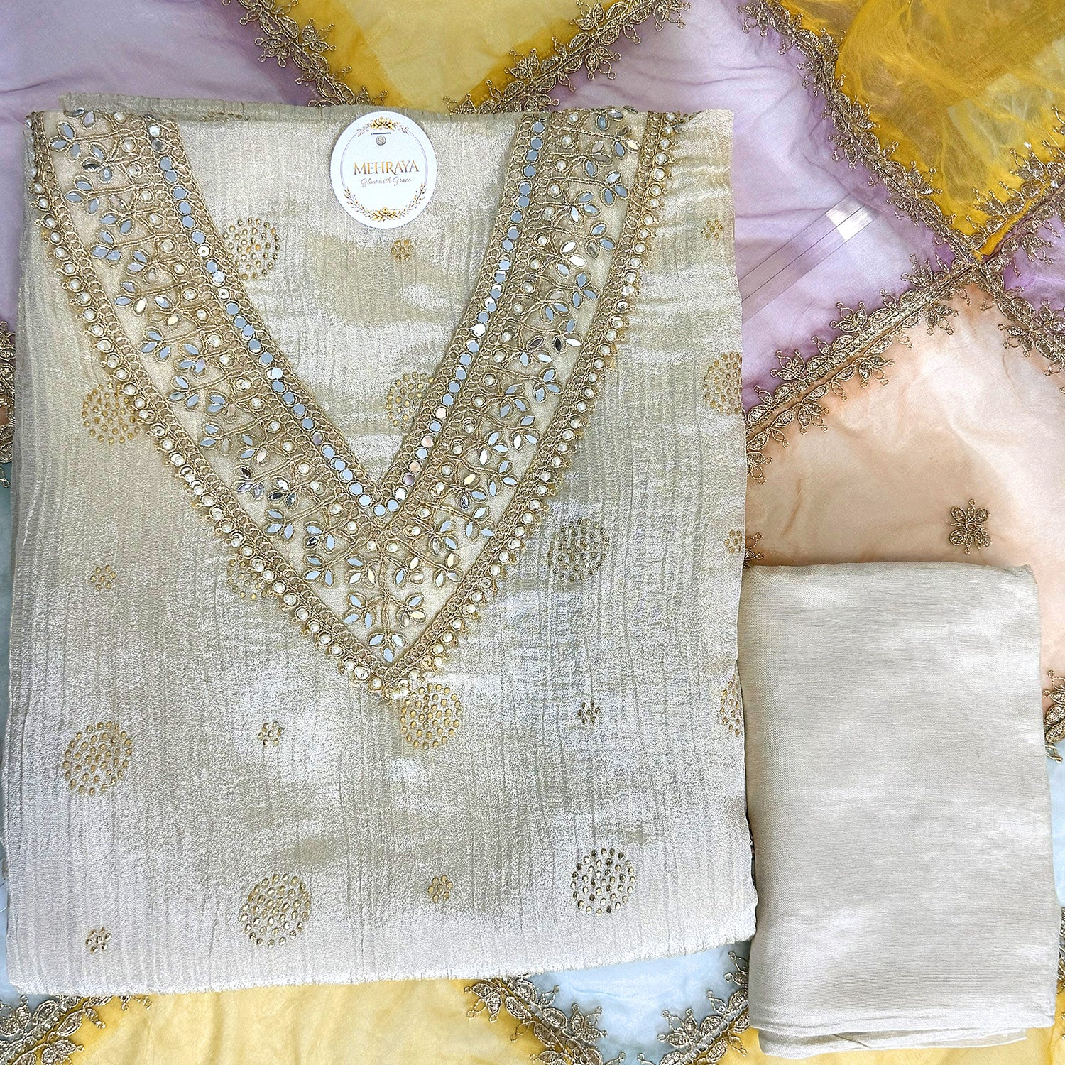 An elegant kurta-dupatta set in soft ivory with a rich V-neck embellished with mirror work, pearls, and gold embroidery. Paired with a pastel multicolor organza dupatta featuring an ornate golden border and a plain matching bottom.