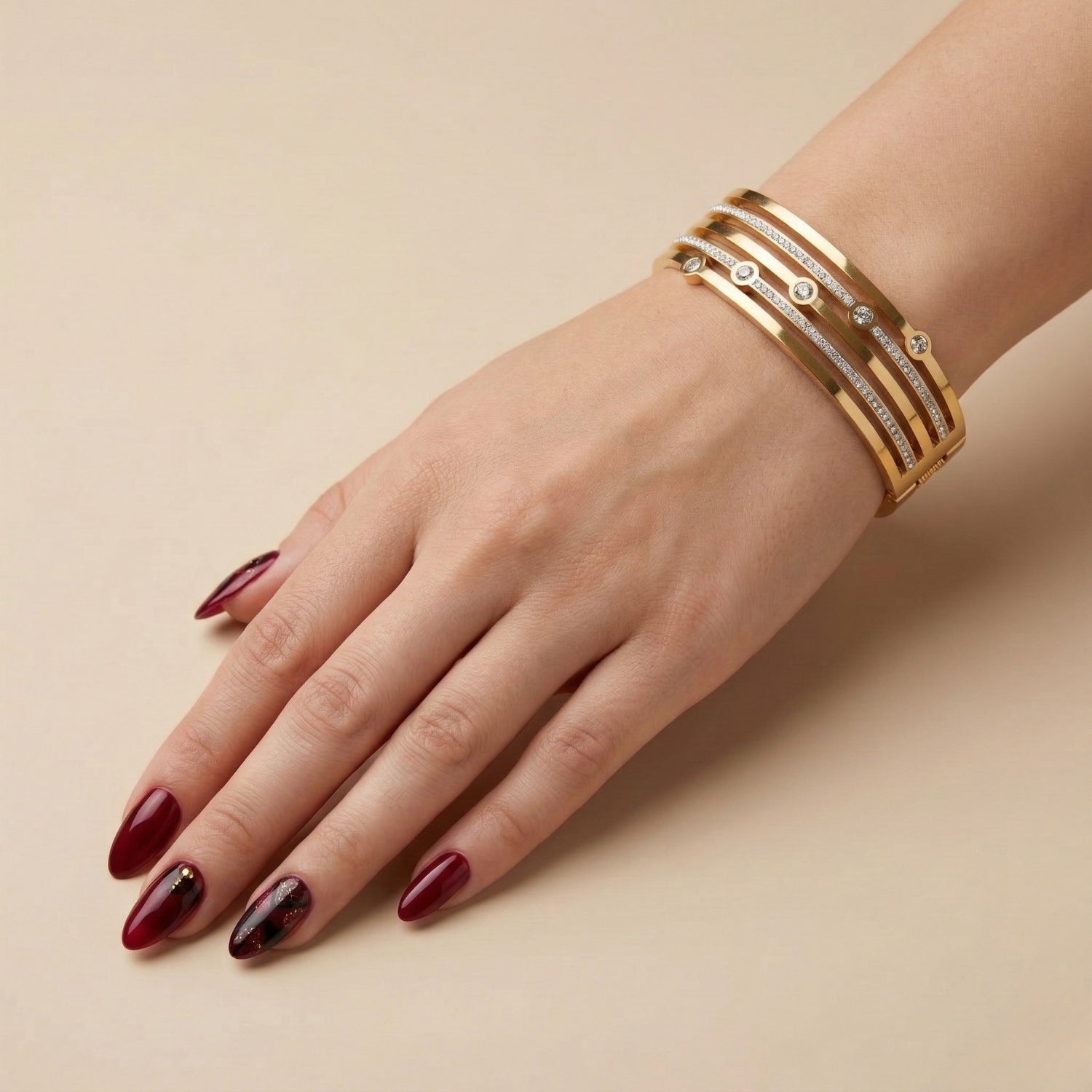 Elevate your jewelry collection with this elegant gold-tone cuff designed to catch the light from every angle. Multiple sleek bands intertwined with brilliant-cut crystals create the look of a perfectly stacked bracelet. Scattered bezel-set stones add a modern sparkle, perfect for both office wear and evening elegance.