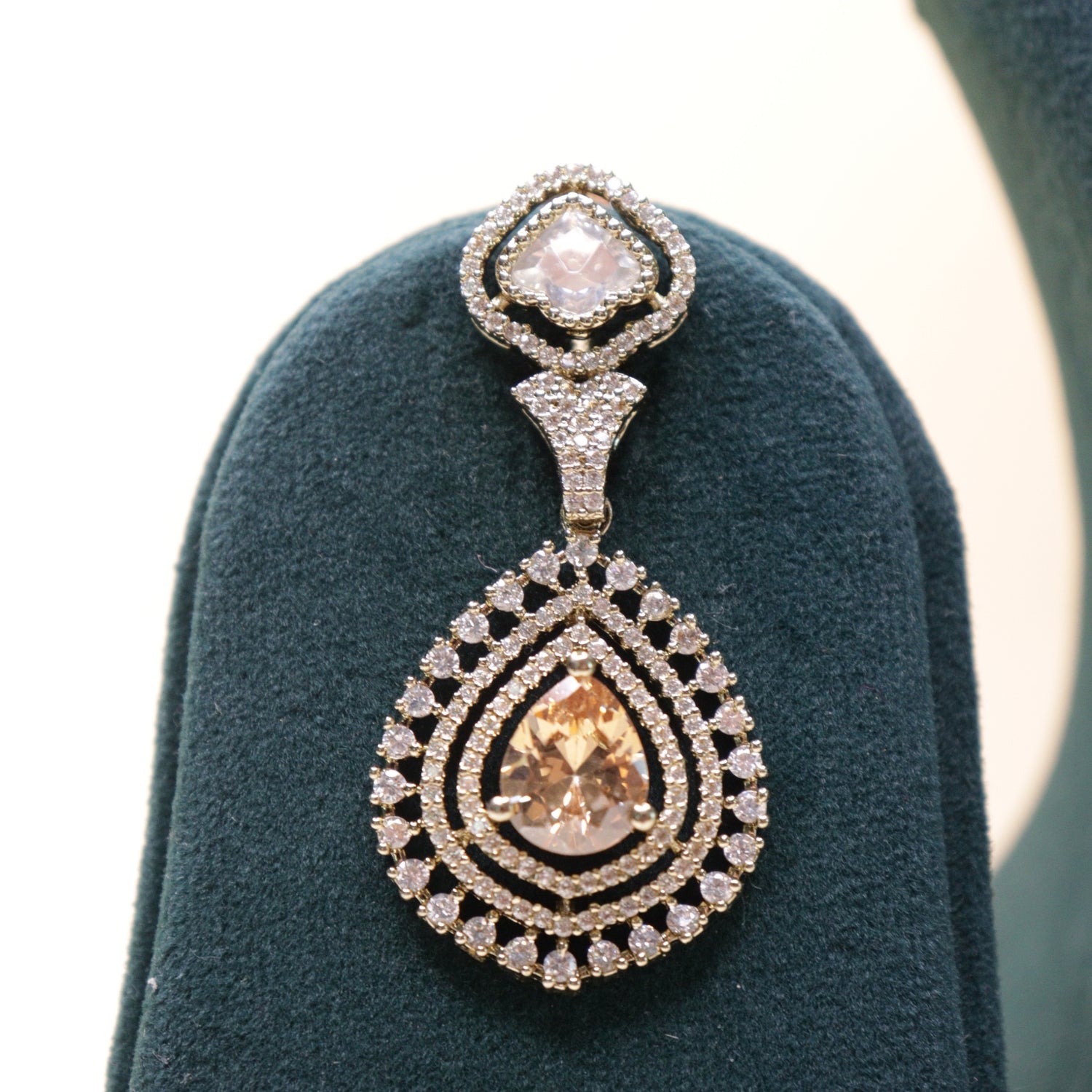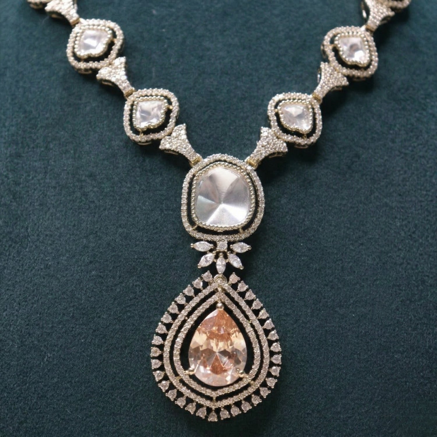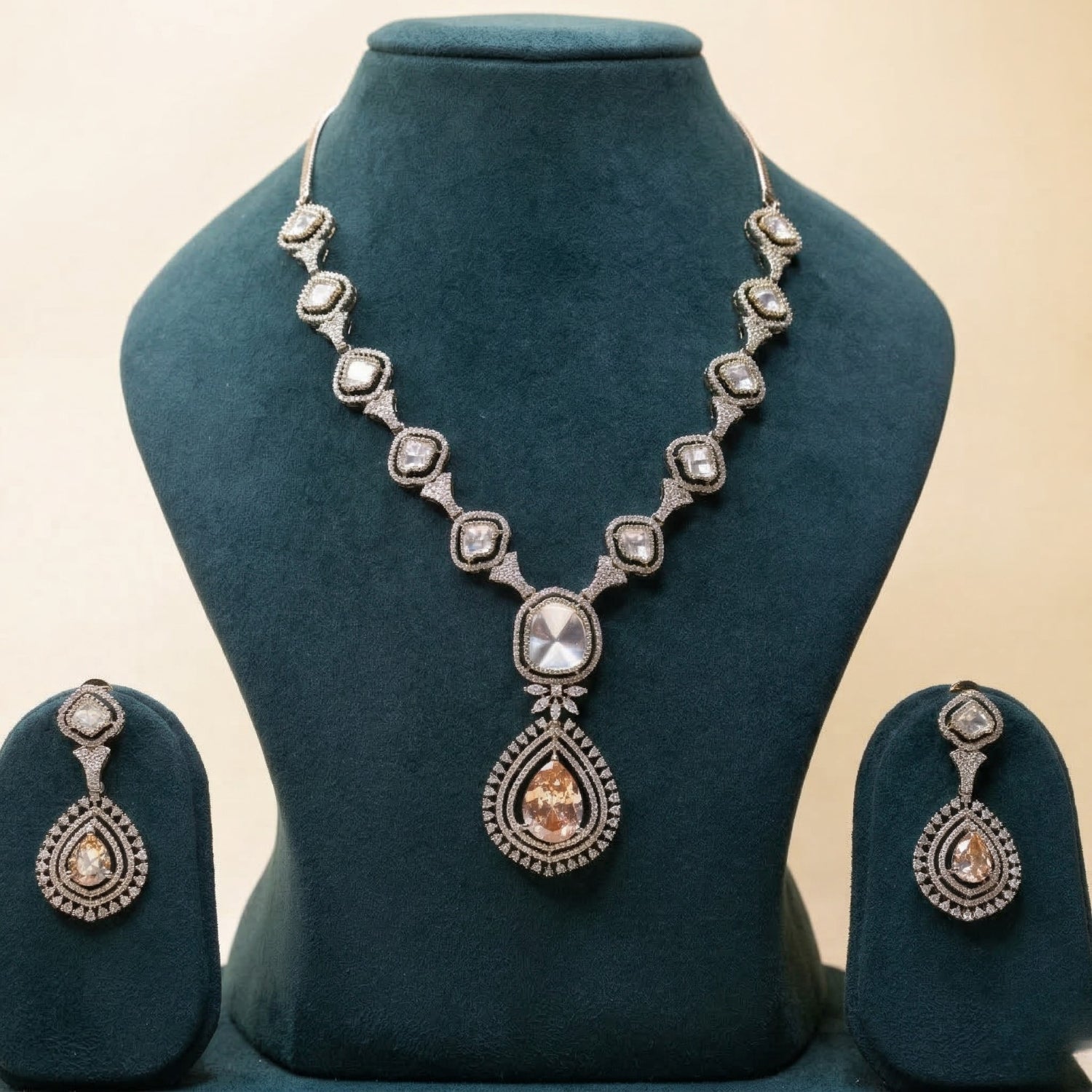 Elevate your evening ensemble with this exquisite silver-toned jewelry suite, featuring a meticulously crafted necklace and matching drop earrings. Designed for the modern woman who cherishes traditional aesthetics, this set centers around breathtaking champagne-hued pear-cut stones encased in brilliant micro-pavé halos.