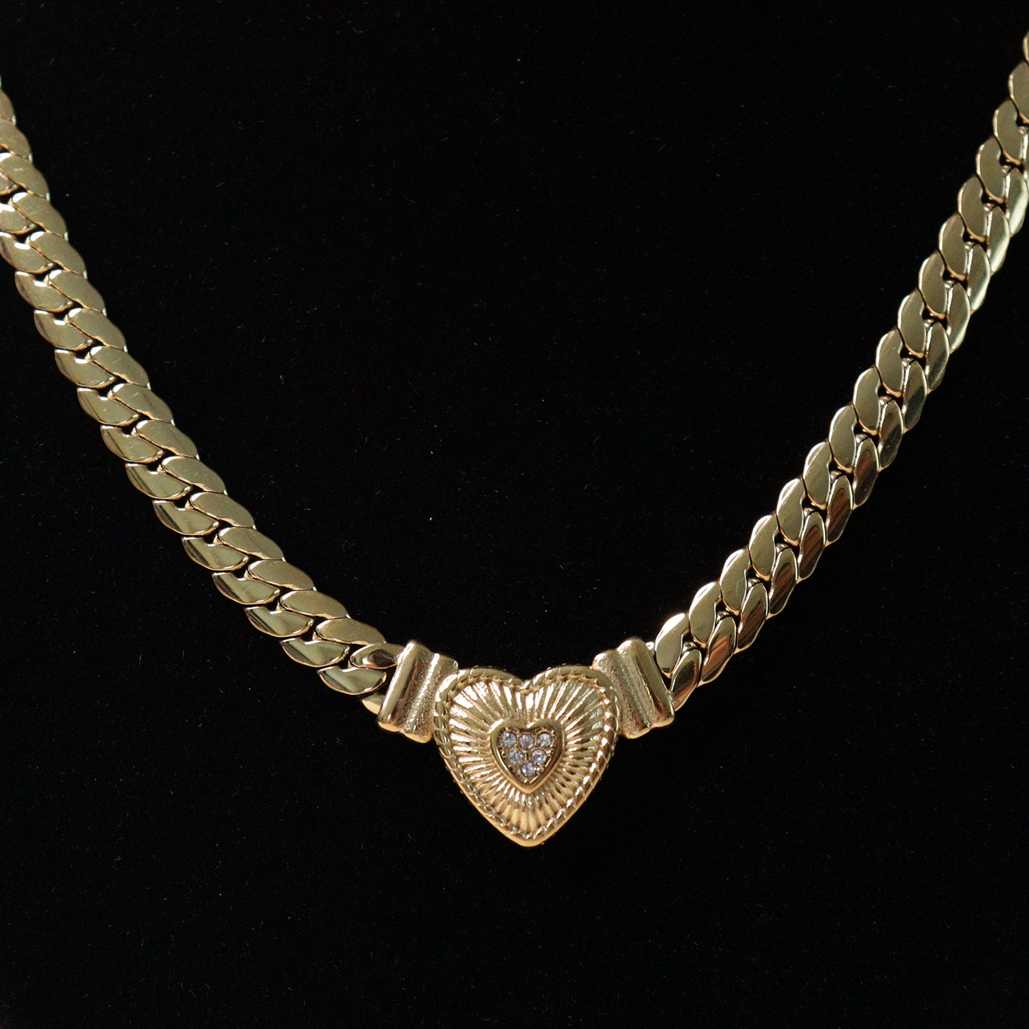 This elegant gold-tone neck chain features a bold curb chain design that beautifully frames the neckline. At the center, a textured heart pendant with delicate stone detailing adds a touch of sparkle and romance. The polished finish and refined craftsmanship give it a luxurious yet modern appeal.