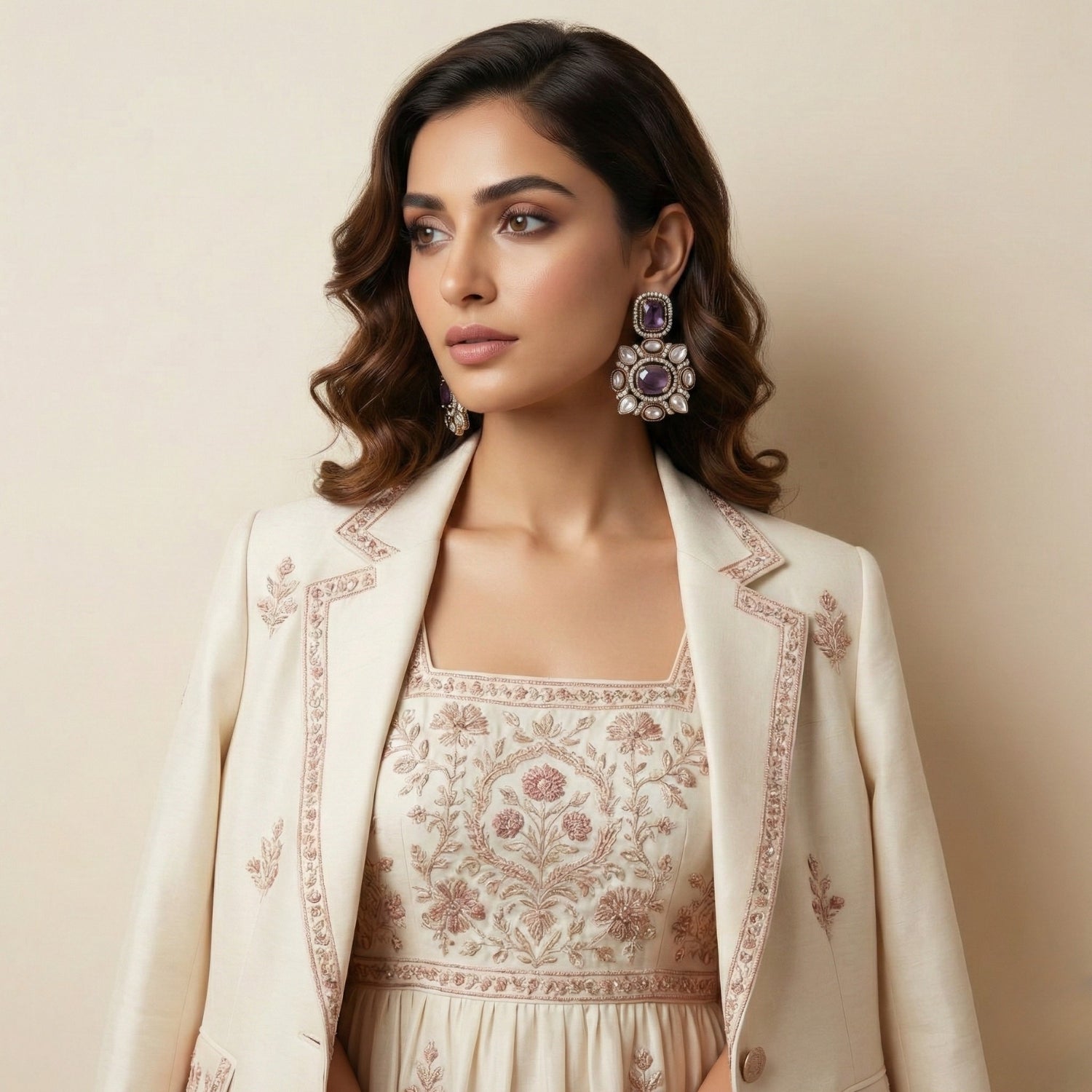 Vintage Square Drops Earrings showcase an ornate antique gold-tone design highlighted with a statement center stone and fine crystal detailing. Accented with American Diamonds, Smoky Quartz and delicate pearls, they reflect classic vintage charm.