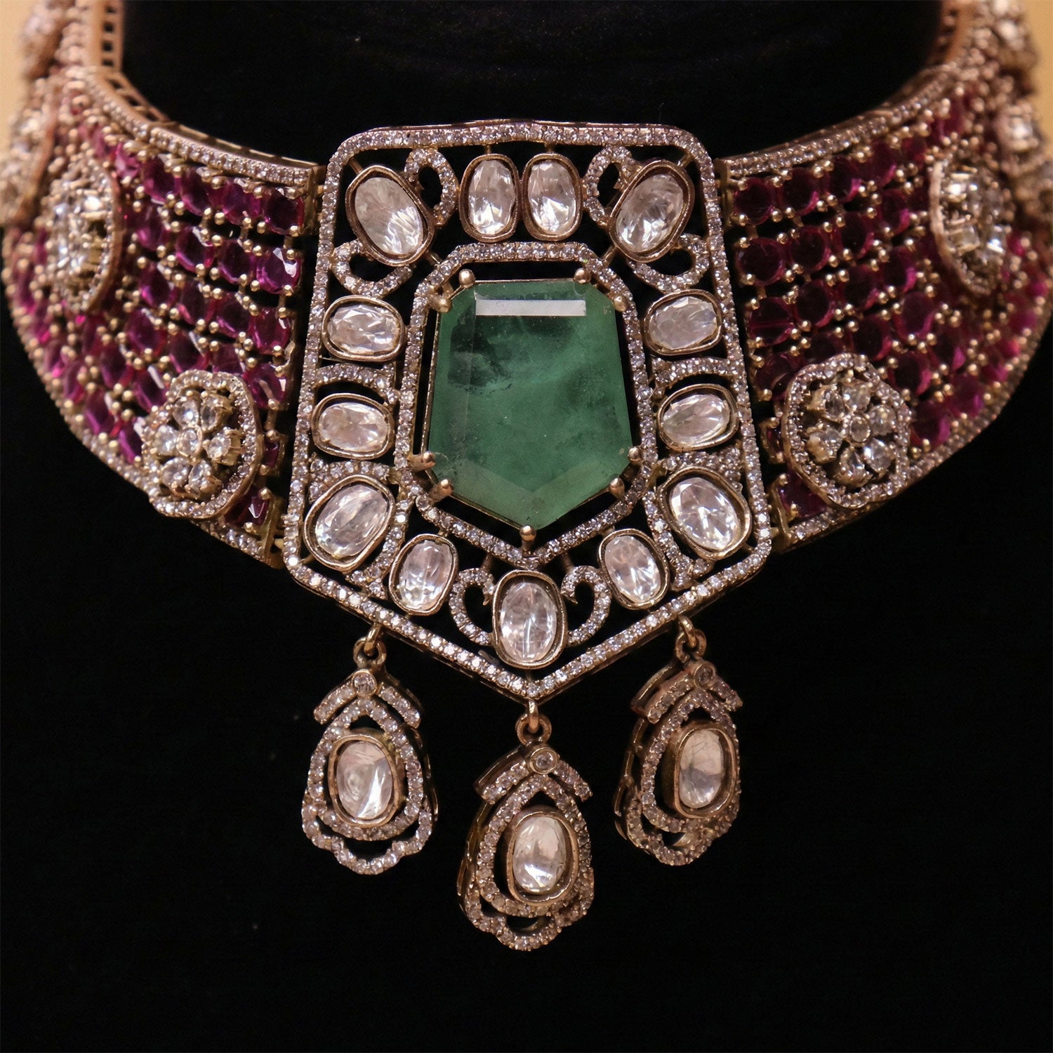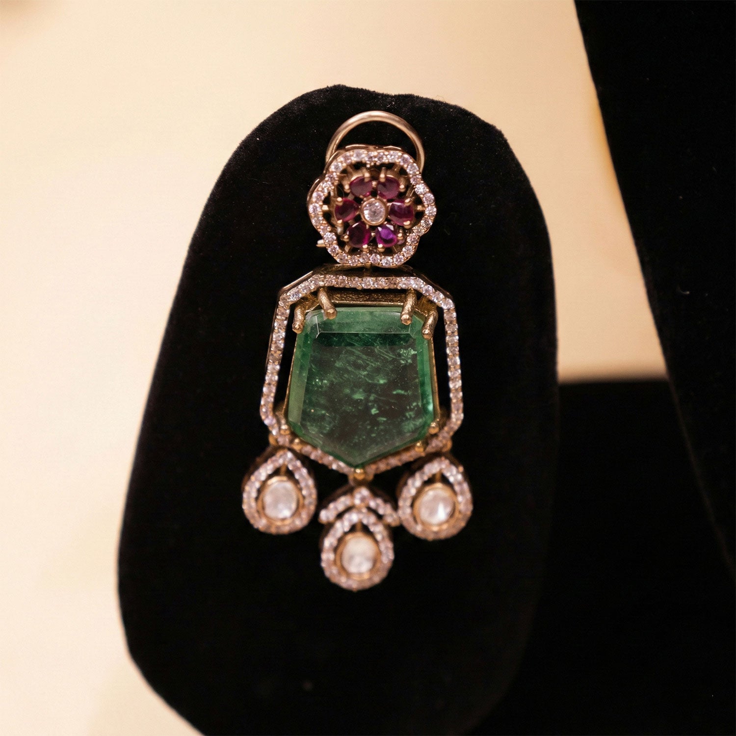 Material: Emerald stone, Uncut diamond (polki) stones, gold-tone metal.
